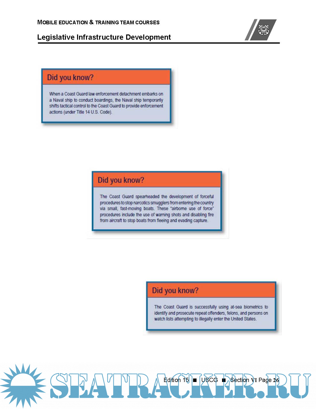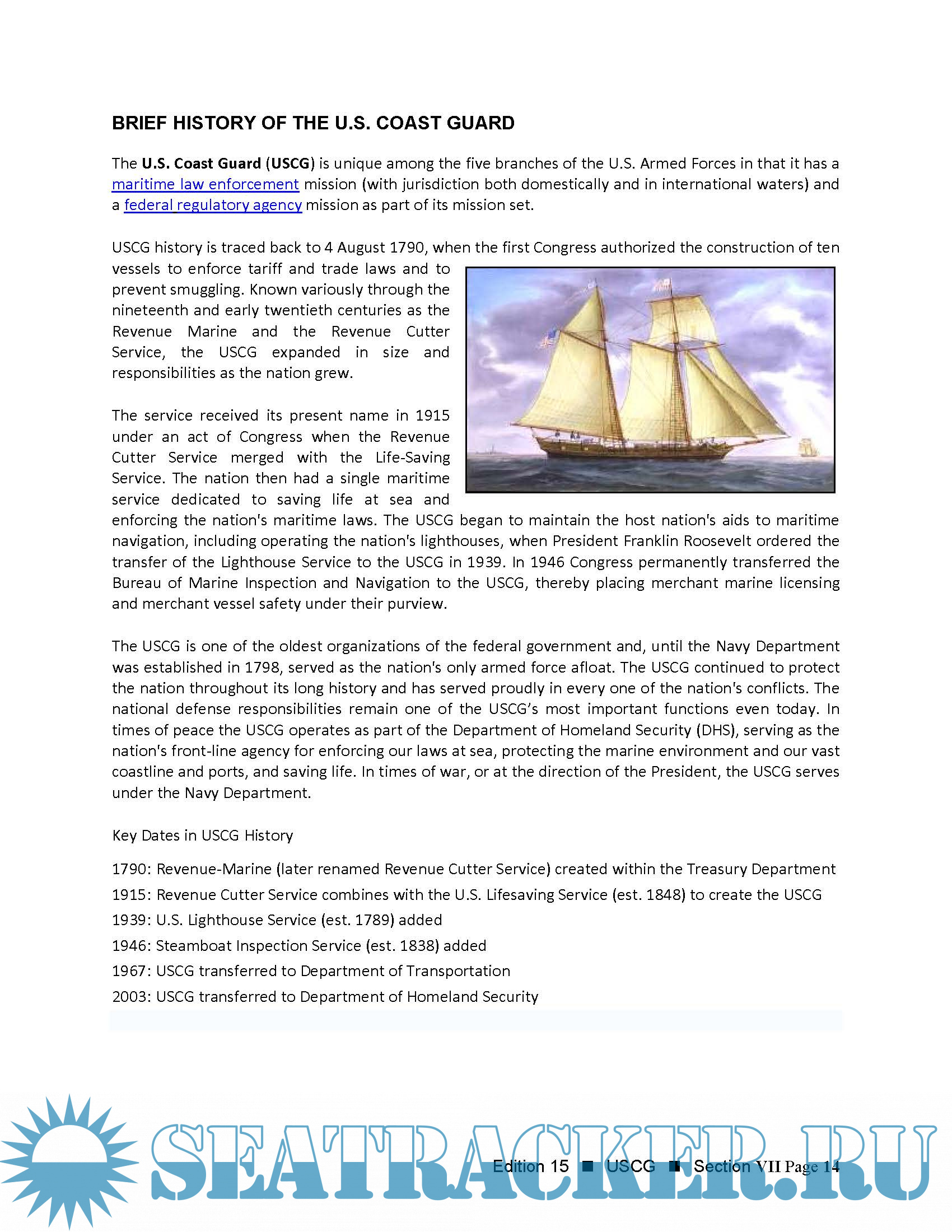 Year: 2017 Language: english Author: USCG Genre: Handbook Format: PDF Quality: eBook Pages count: 219 Description: This handbook is intended to provide Security Cooperation Officers and foreign maritime agencies with information regarding training and education programs offered by the U.S. Coast Guard. As a service, the Coast Guard welcomes opportunities to share relevant capabilities and competencies to our global partners. With experience in whole-of-government solutions, the organization is ideally suited to work alongside both civil and military services. Separate from the Navy, the Coast Guard is a unique force with military status, law enforcement authority, and an internationally recognized role as a humanitarian organization. Foreign governments, navies, coast guards, international organization, and non-governmental organizations can all find a common interest among the broad spectrum of authorities and capabilities maintained by the U.S. Coast Guard.