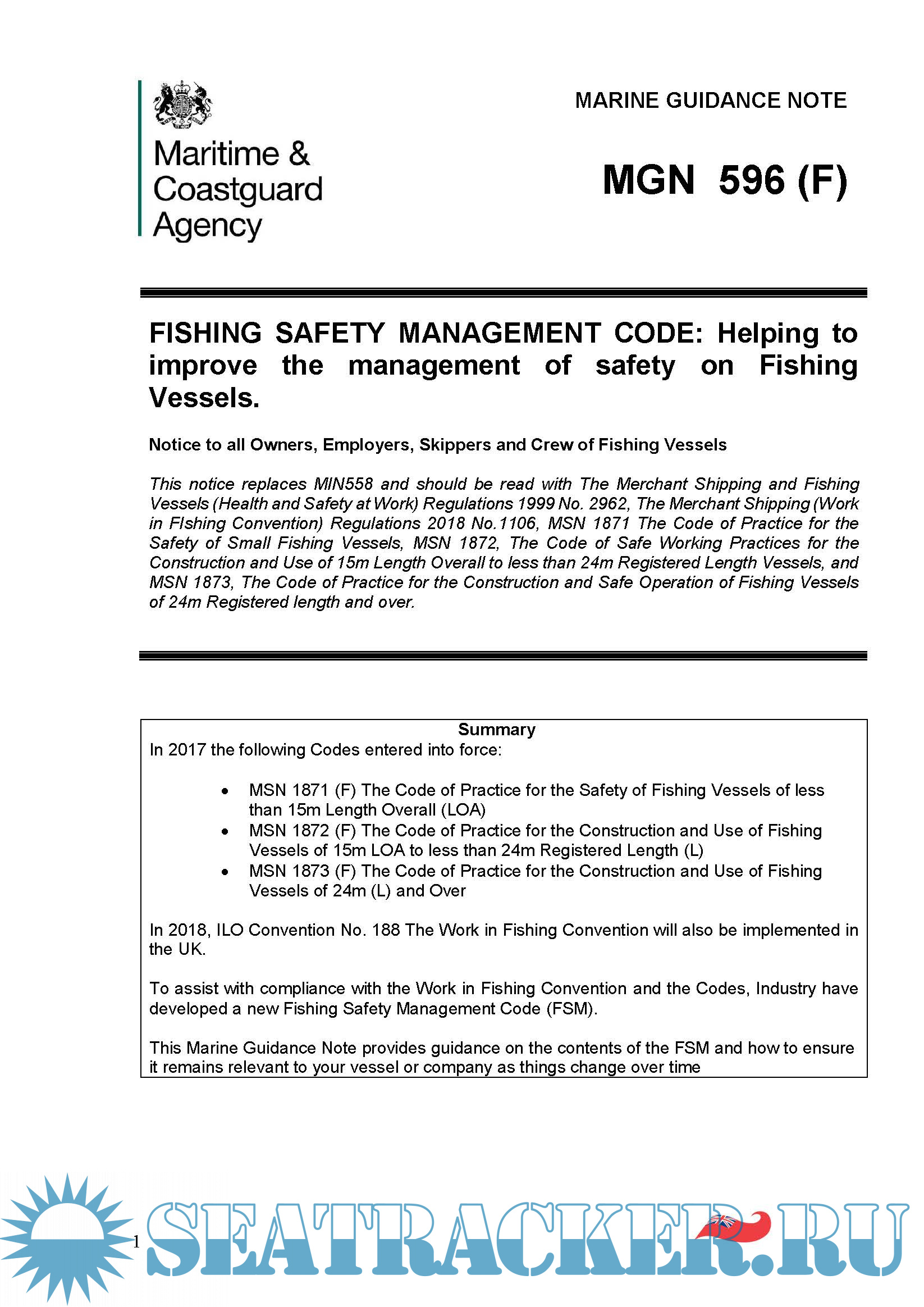 Fishing Safety Management Code, Helping to Improve the Management of Safety on Fishing Vessels MGN 596 (F)