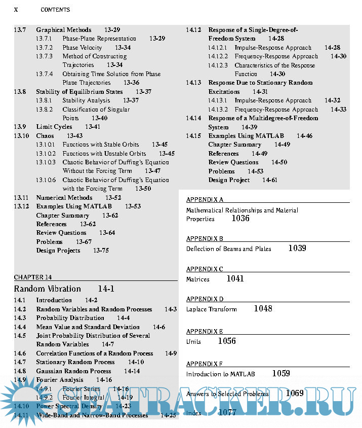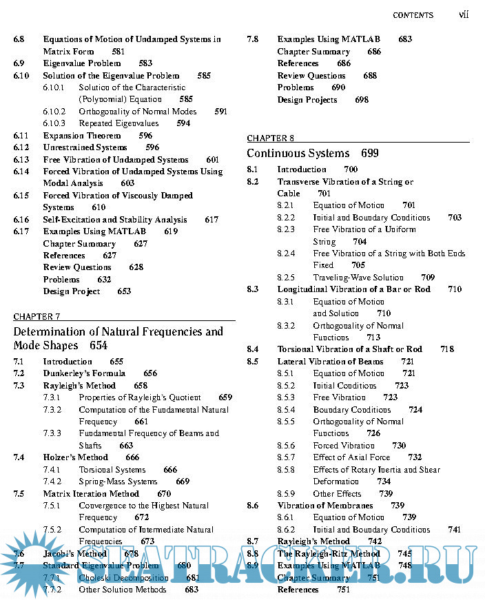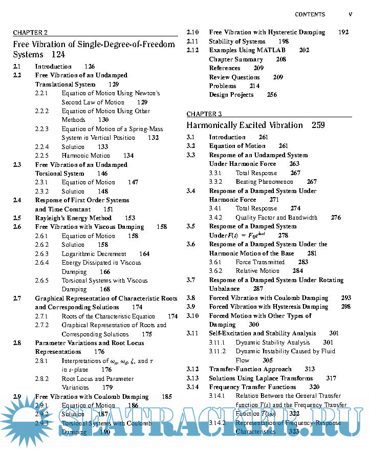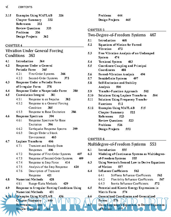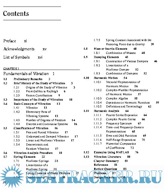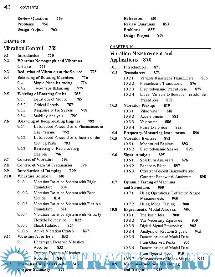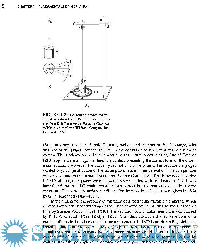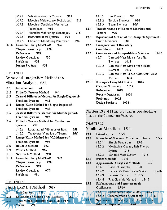 Year: 2011 Language: english Author: S. S. Rao Genre: Textbook Publisher: Pearson Edition: 5th ISBN: 978-0-13-212819-3 Format: PDF Quality: eBook Pages count: 1105 & 1112 Description: This book serves as an introduction to the subject of vibration engineering at the undergraduate level. Favorable reactions by professors and students to the fourth edition have encouraged me to prepare this fifth edition of the book. I have retained the style of the prior editions, presenting the theory, computational aspects, and applications of vibration in as simple a manner as possible, and emphasizing computer techniques of analysis. Expanded explanations of the fundamentals are given, emphasizing physical significance and interpretation that build upon previous experiences in undergraduate mechanics. Numerous examples and problems are used to illustrate principles and concepts.