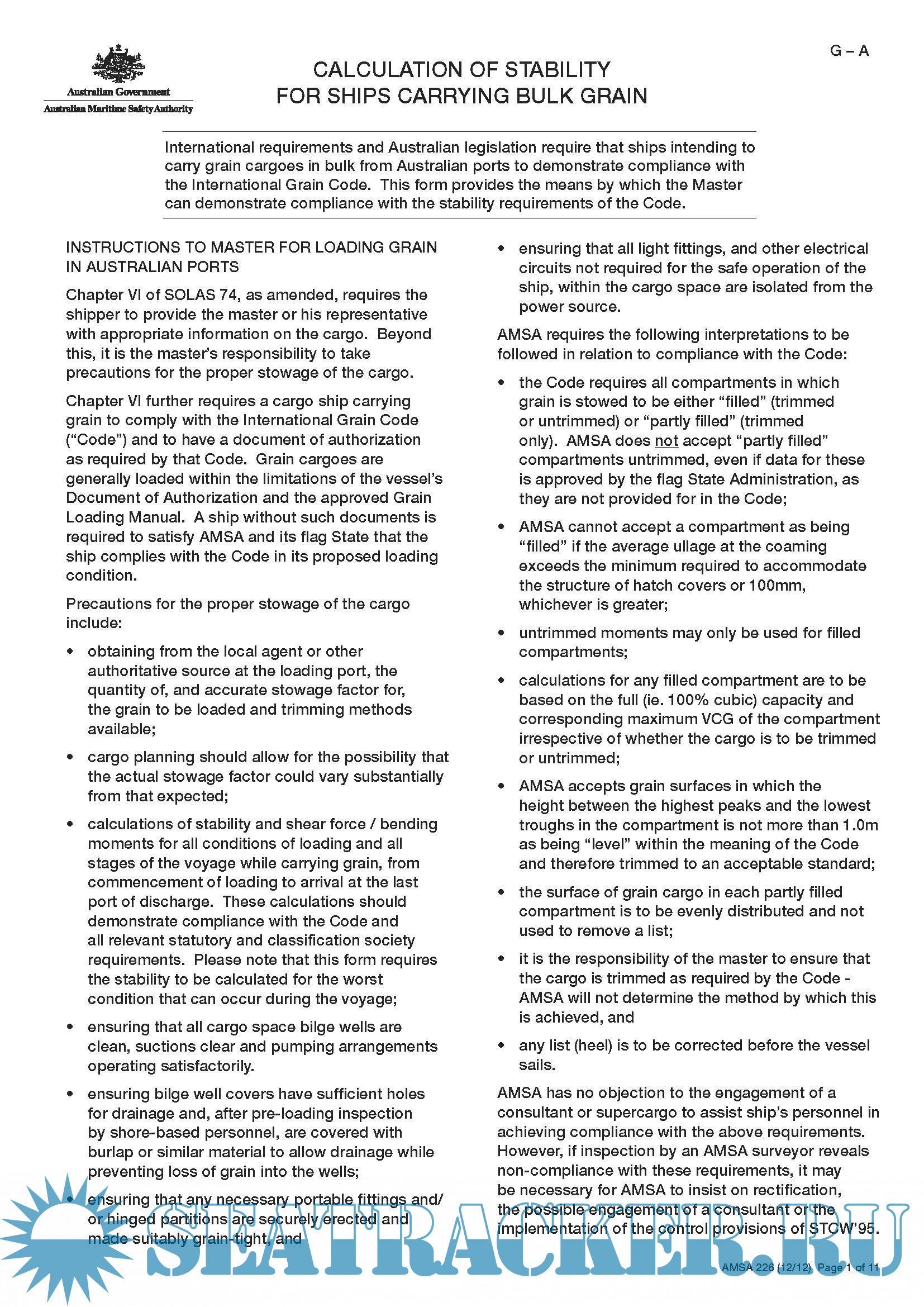 3. Instructions to Master for Loading Grain in Australian Ports with Calculation form of Stability for Ships Carrying Bulk Grain