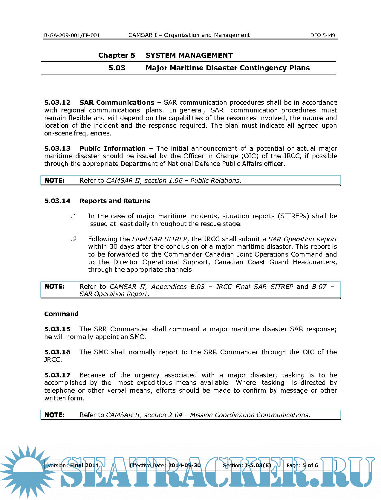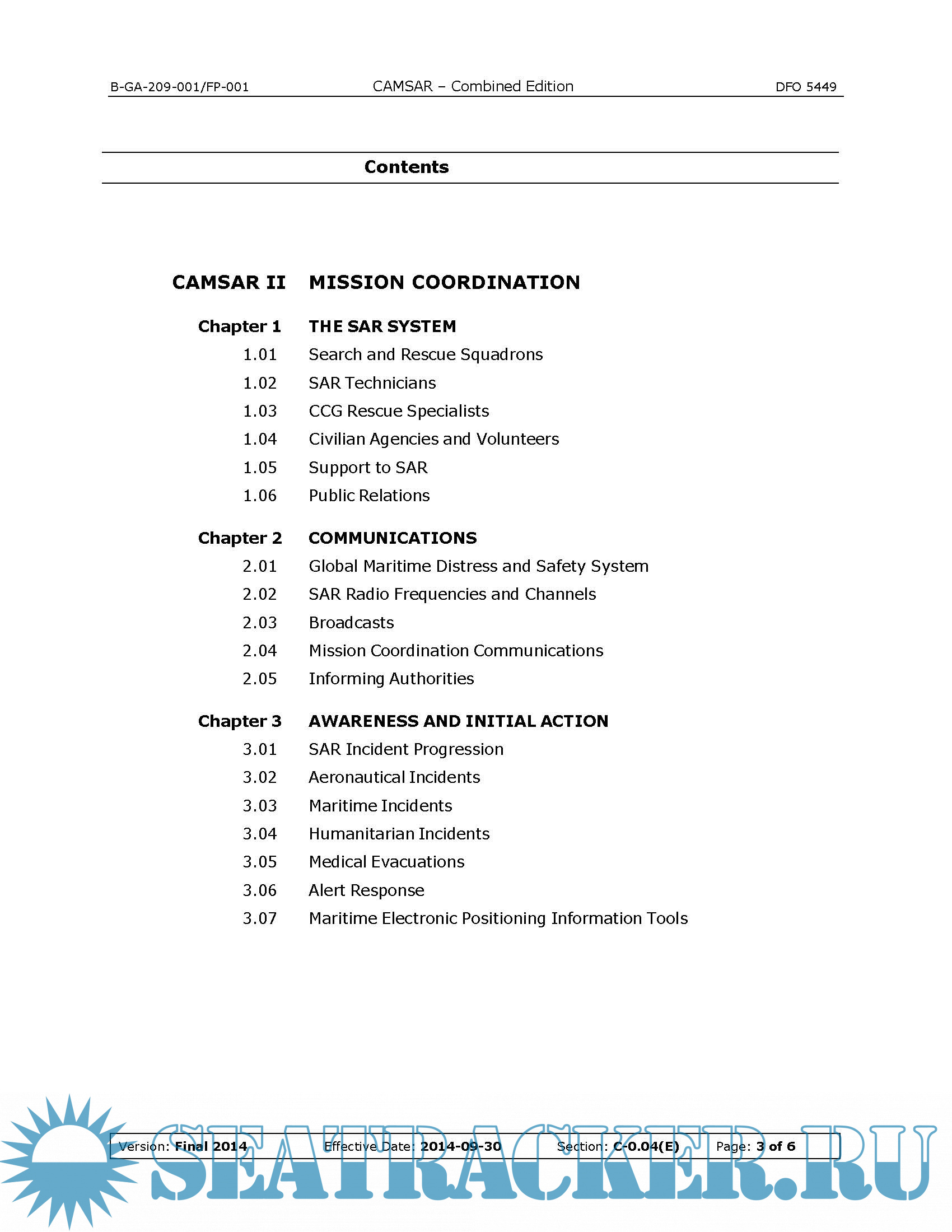 Year: 2014 Language: english Author: Canadian Coast Guard Genre: Manual Format: PDF Quality: eBook Pages count: 522 Description: The purpose of the Canadian Aeronautical and Maritime Search and Rescue (CAMSAR) Manual is to supplement the International Aeronautical and Maritime Search and Rescue (IAMSAR) Manual by providing national guidelines and standard operating procedures (SOPs) specific to the Canadian Federal Aeronautical and Maritime Search and Rescue (SAR) System. In turn, the CAMSAR Manual is meant to be augmented by regional and local SOPs. There are three volumes to the CAMSAR Manual: • Volume I – Organization and Management, called CAMSAR I, for short, and is intended to be used in conjunction with the other two CAMSAR volumes and the IAMSAR Manual, Volume I; • Volume II – Mission Coordination, called CAMSAR II, and is intended to be used in conjunction with the other two CAMSAR volumes and the IAMSAR Manual, Volume II; and • Volume III – Mobile Facilities, called CAMSAR III, and is intended to be used in conjunction with the other two CAMSAR volumes and the IAMSAR Manual, Volume III. Vol III is for Mobile Facilities (Vessels and Aircraft) For ease of reference, each of the CAMSAR volumes bears the same title as the corresponding IAMSAR Manual volume, and is also divided into corresponding chapters. The three volumes of the CAMSAR Manual supersede all previous versions