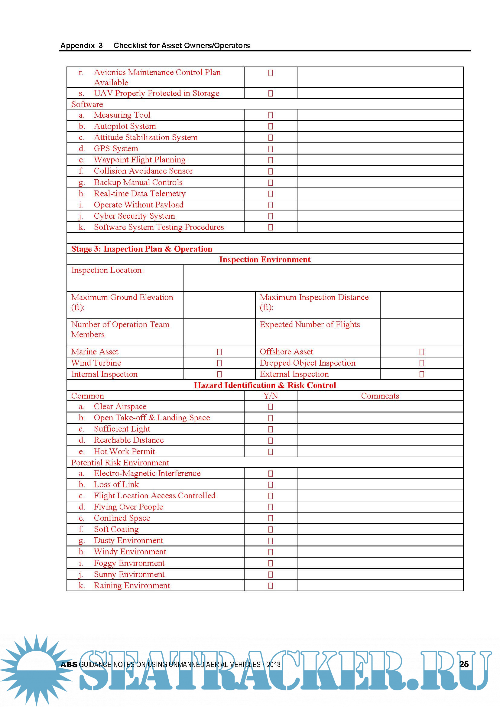 Year: 2018 Language: english Author: ABS Genre: Guide Format: PDF Quality: eBook Pages count: 30 Description: Unmanned Aerial Vehicles (UAVs), as a remote inspection technique, allows the attending Surveyor to evaluate the condition of the structure from a stationary location. This technique also provides a benefit to the asset Owner/Operator by reducing operational intrusiveness. These Guidance Notes are intended to offer best practices for class surveys and non-class inspections carried out using UAVs. These best practices include recommendations and guidance on applications of UAVs, qualification and proficiency of the UAV Service Provider, UAV operation and data handling, all intended to facilitate a safer, more effective and efficient survey. IACS Recommendations No. 42, Guidelines for Use of Remote Inspection Techniques for Surveys, has been considered in the development of these Guidance Notes.