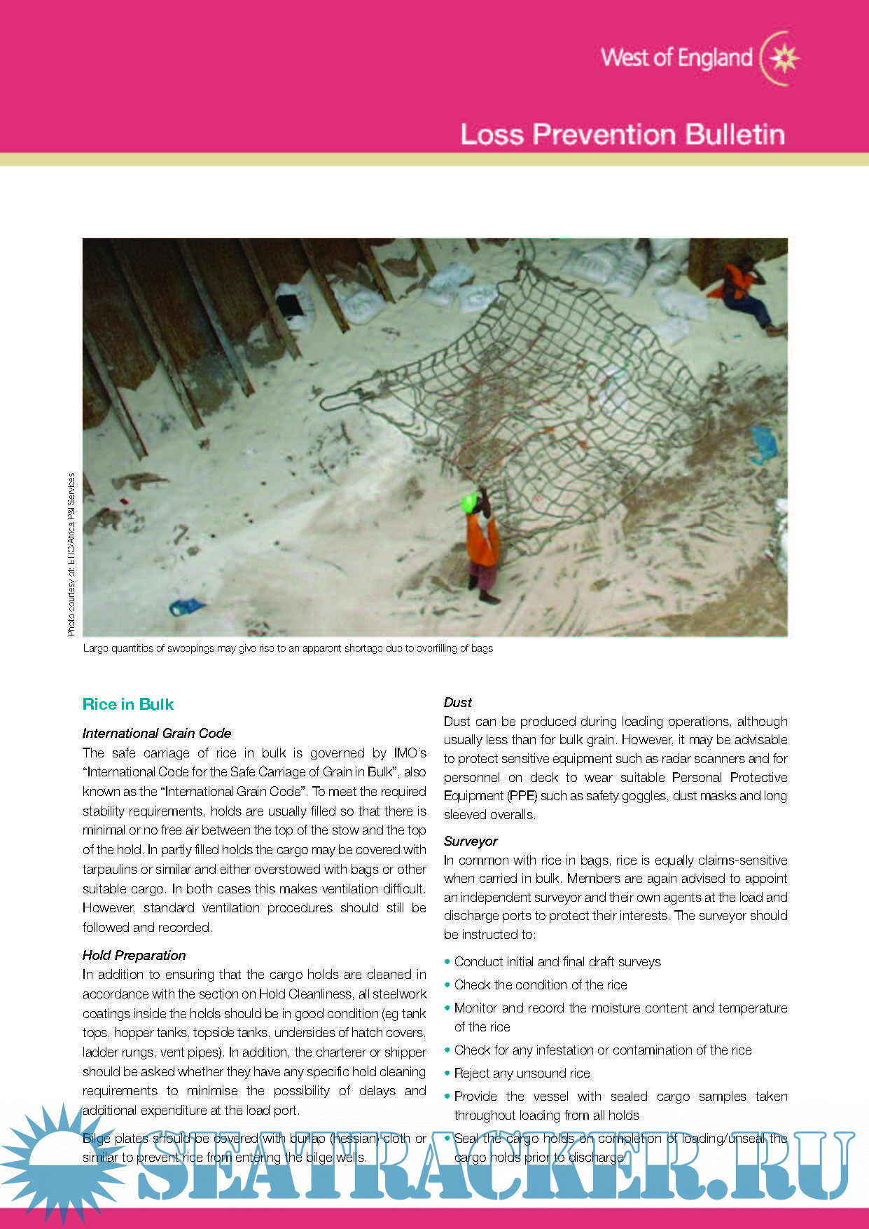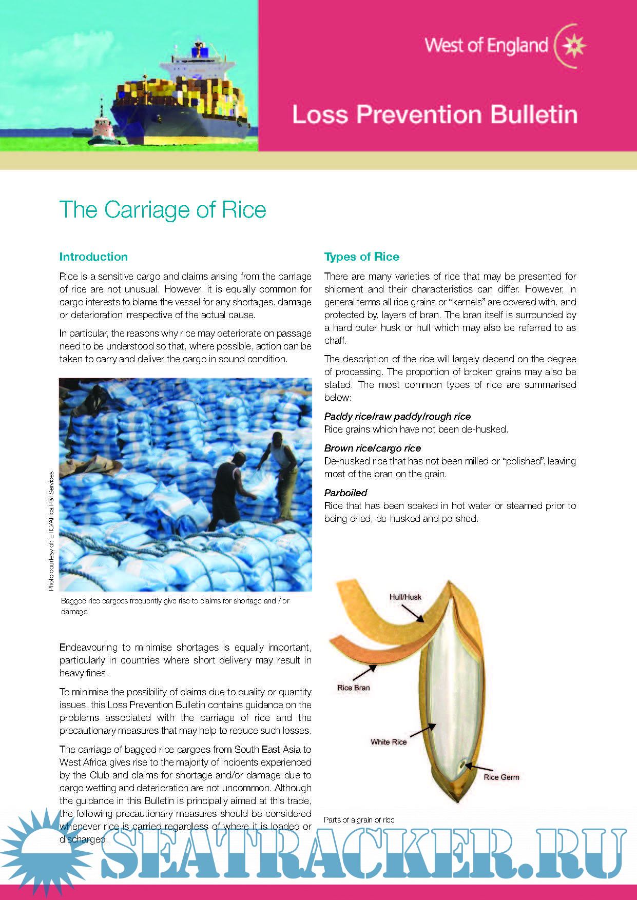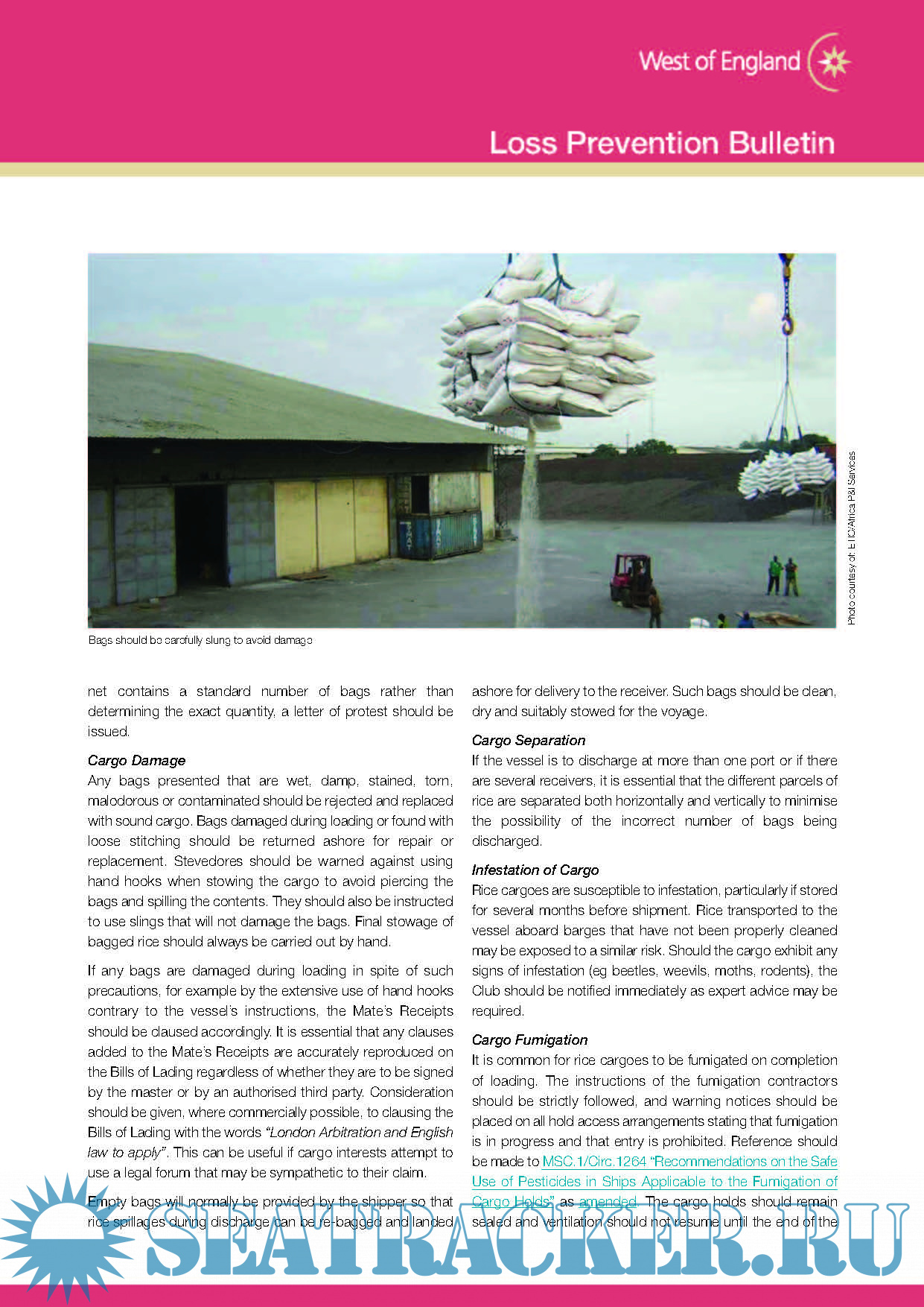 Description: The carriage of rice in bags and in bulk is an established trade. However, claims for damage and/or shortages frequently arise. The reasons why rice may deteriorate need to be understood so that, so far as possible, action can be taken to deliver the cargo in a sound condition. Endeavouring to minimise shortages is equally important as in addition to claims for short delivery, some countries may impose a heavy fine.