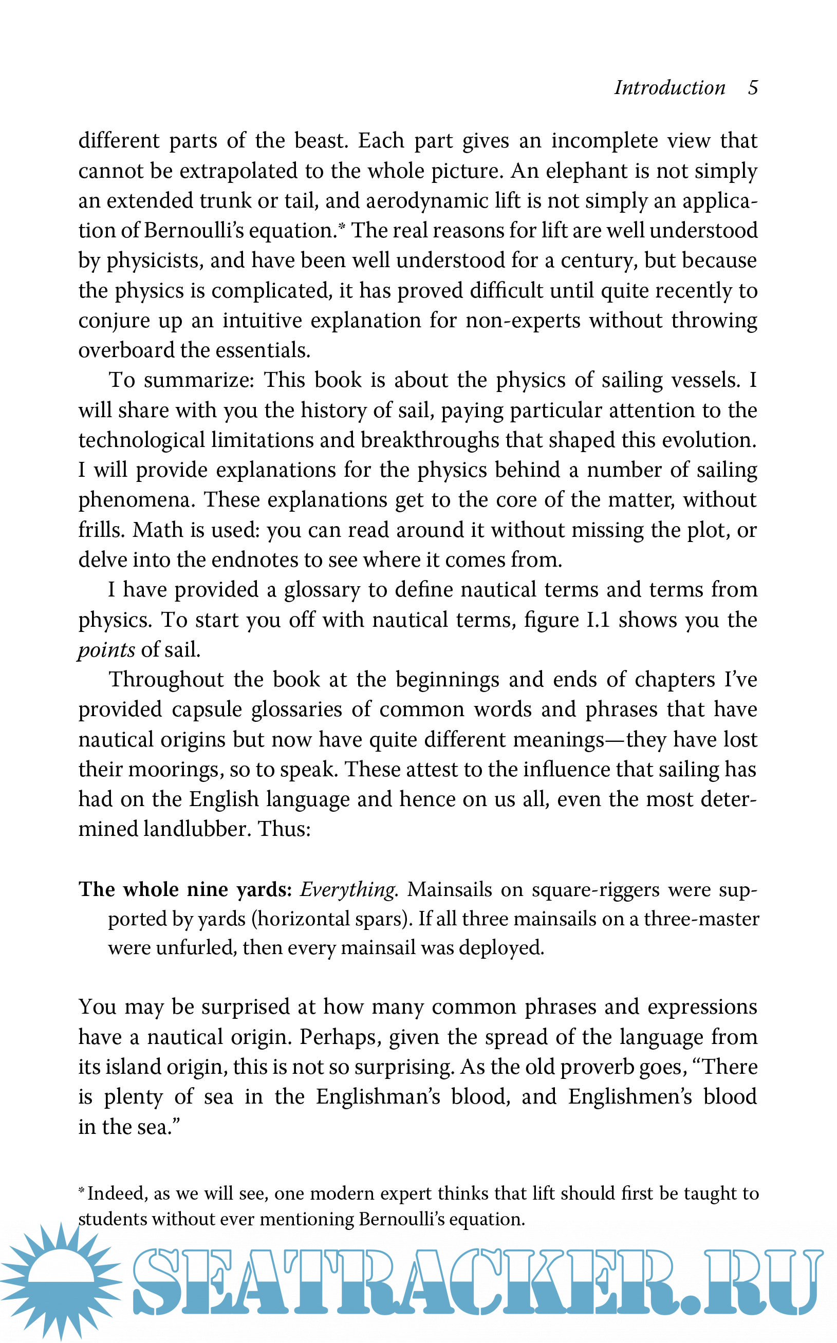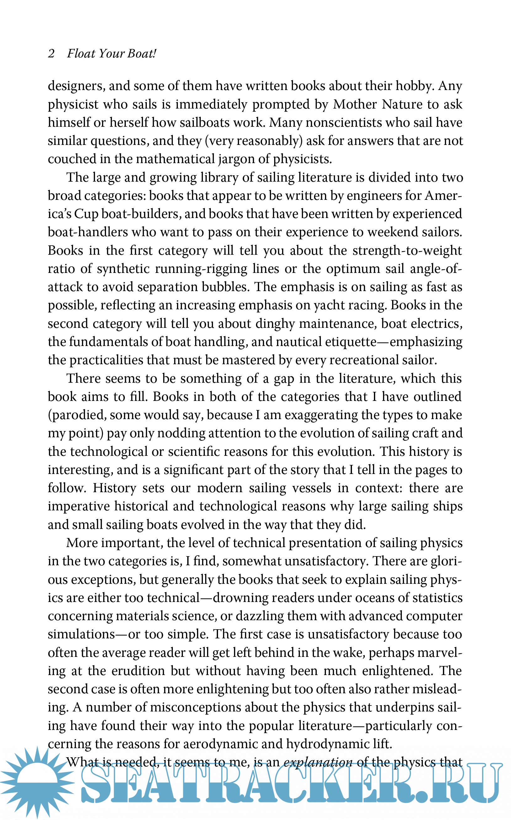 Year: 2009 Language: english Author: Mark Denny Genre: Other Publisher: The Johns Hopkins University Press ISBN: 978-0-8018-9009-3 Format: PDF Quality: eBook Pages count: 275 Description: An estimated 4.1 million people in the United States participate in recreational sailing. Yet the large library of sailing literature leaves many of them high and dry. On one side are technical guides for America’s Cup boat-builders; on the other, simplistic books for weekend sailors with little interest in science. In Float Your Boat! professional and amateur boaters alike will find intelligent and understandable answers to such questions as: What were the key innovations that made sailboats more efficient? How do you increase the speed of a boat? How do sailboats travel into the wind? Why are so many explanations of sailing so wrong? Sailing enthusiast and physicist Mark Denny first traces the evolution of the sailing craft, from prehistoric coracles made of animal skins and antlers to the sailboat’s reinvention as a pleasure craft during the Industrial Revolution. He then identifies specific sailing phenomena?how wind drives modern Bermuda sloops, how torque determines stability, why hull speed exists?and provides the key physics principles behind them. Whether you are an inquisitive landlubber who has never set foot in a boat, a casual weekend sailor, or an old salt who lives for the sea, Float Your Boat! is an accessible guide to the physics of sailing. PS See my other releases in the "Yachting, sailing, boating" topic: https://seatracker.info/tracker.p...id=54420#results