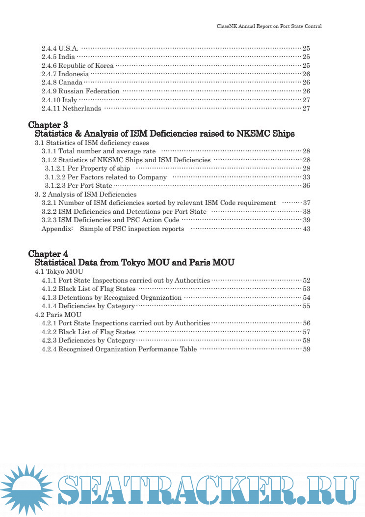 Description: This annual Port State Control (PSC) report summarizes deficiencies identified by PSC inspections carried out in various countries around the world. This report is prepared withthe objective of building awareness of the present state of PSC as well as to improve future maintenance and inspections, and also Safety Management System is compiled into the regulations.