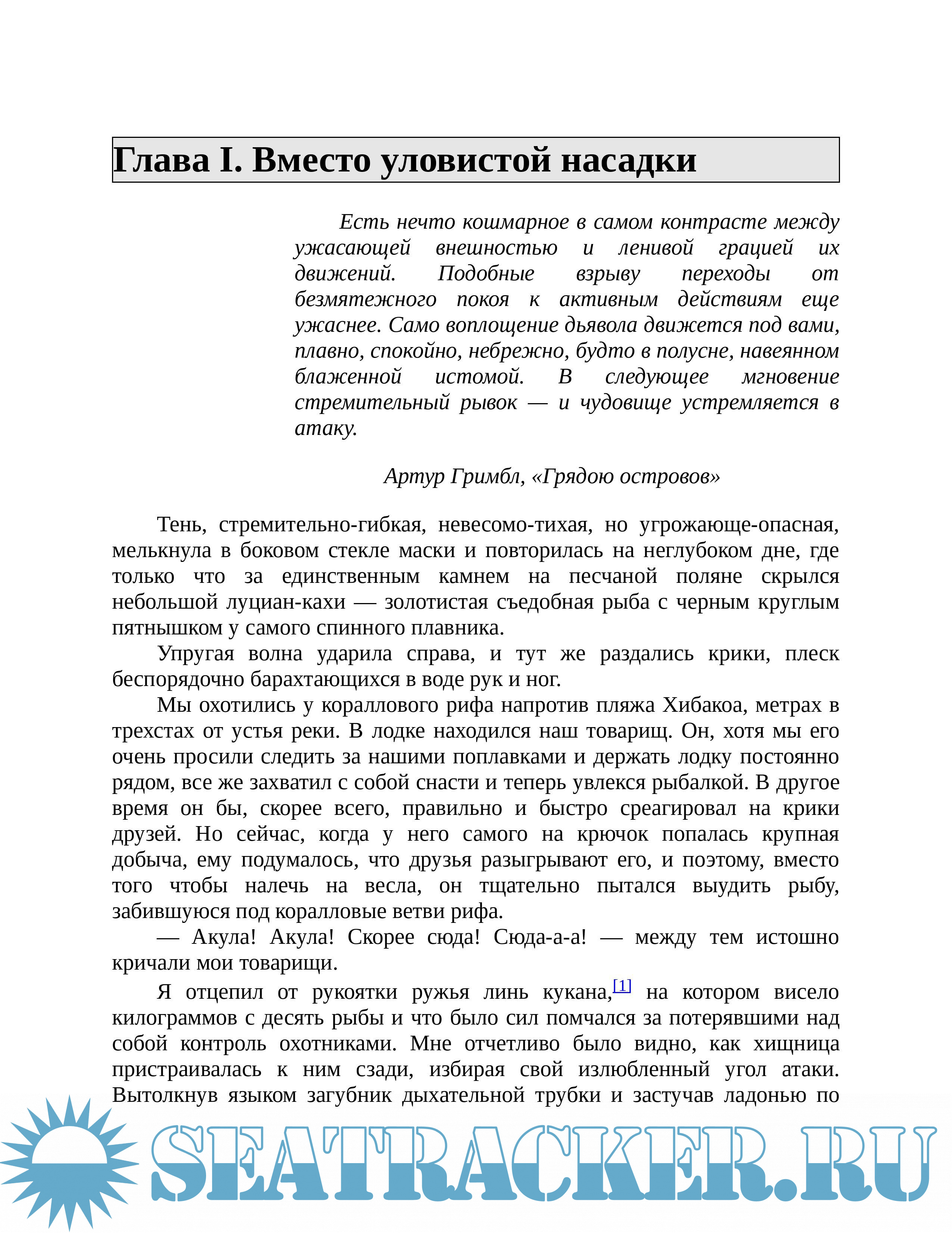 Описание: В книге рассказывается о подводной охоте в глубинах океана, об увлекательной, романтичной и в то же время полной опасностей охоте на акул, о необыкновенной жизни многочисленных обитателей подводного царства.