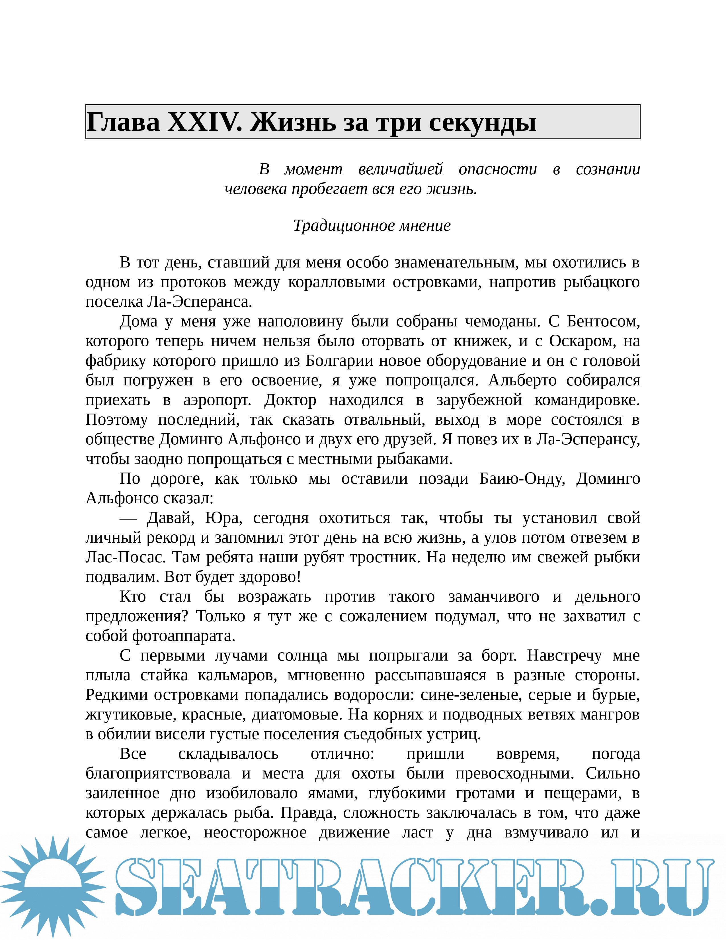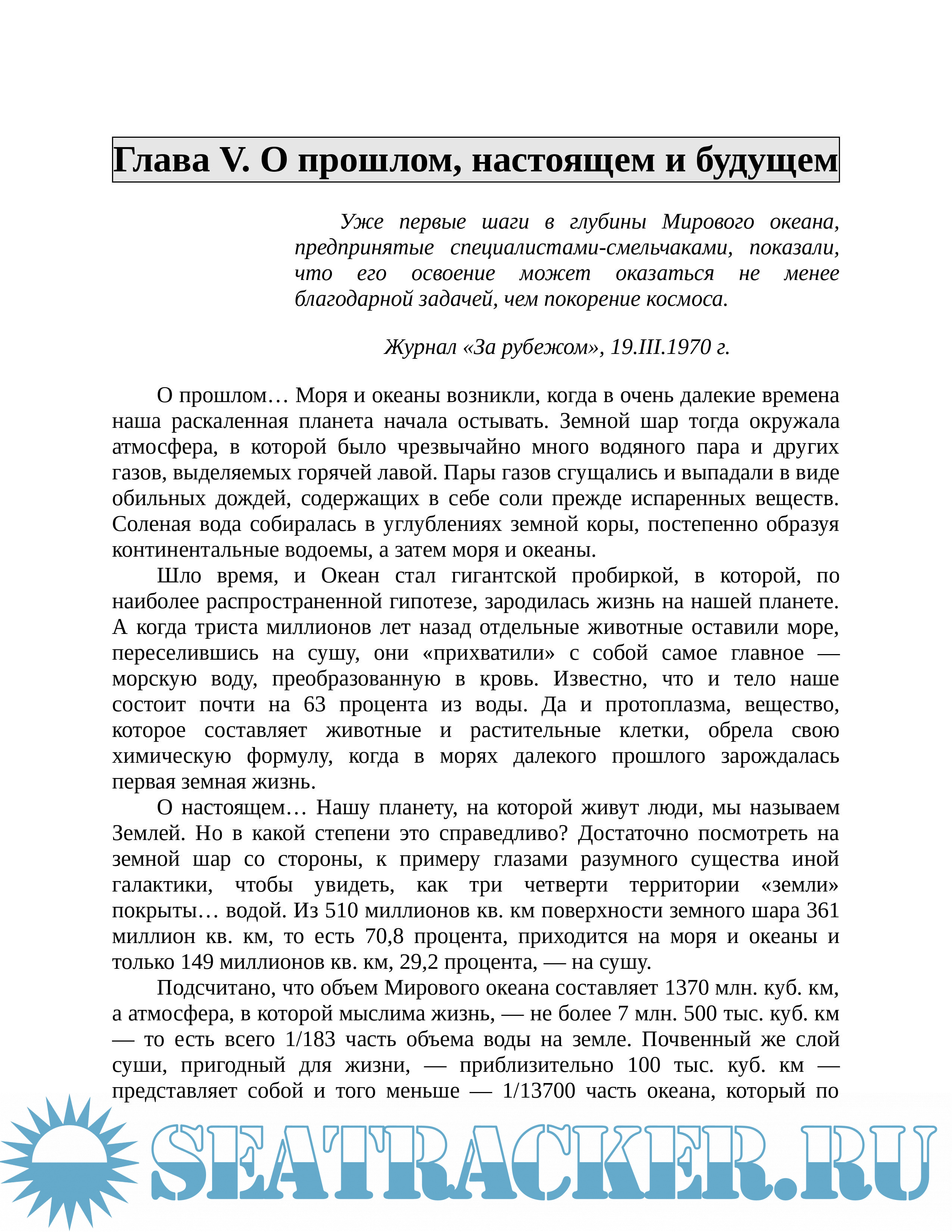 Автор затрагивает и вопросы охраны подводного мира, хозяйского отношения к нему. Океан может давать нам гораздо больше, чем он дает. Уже сейчас все больше подводных охотников превращаются в исследователей жизни морей и океанов.