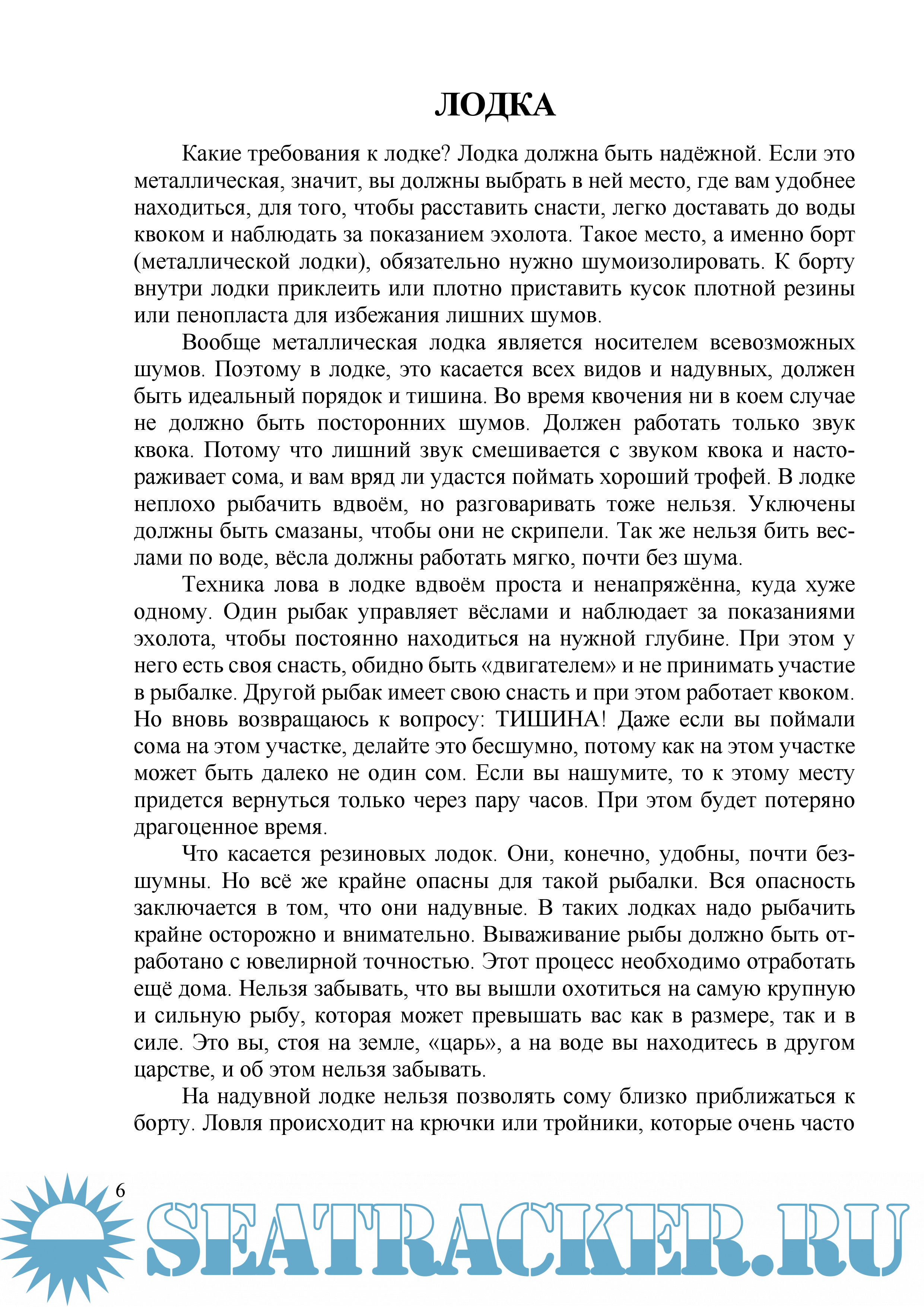 ЛОДКА 6 ЛАВКА 8 ВОДНЫЙ ПАРУС 10 РУКАВИЦЫ 14 БАННИК 16 НОЖ 20 ЭХОЛОТ 21 КВОК 27 СНАСТИ 33 КАПРОНОВЫЙ УРЕЗ 40 НАЖИВКА 43 СОМОВЬЯ ЯМА 57 ТЕХНИКА ЛОВА 61 КАК СОХРАНИТЬ РЫБУ 72 ВРЕМЯ ГОДА, ПОГОДА 73 БЛЮДА ИЗ СОМА 77