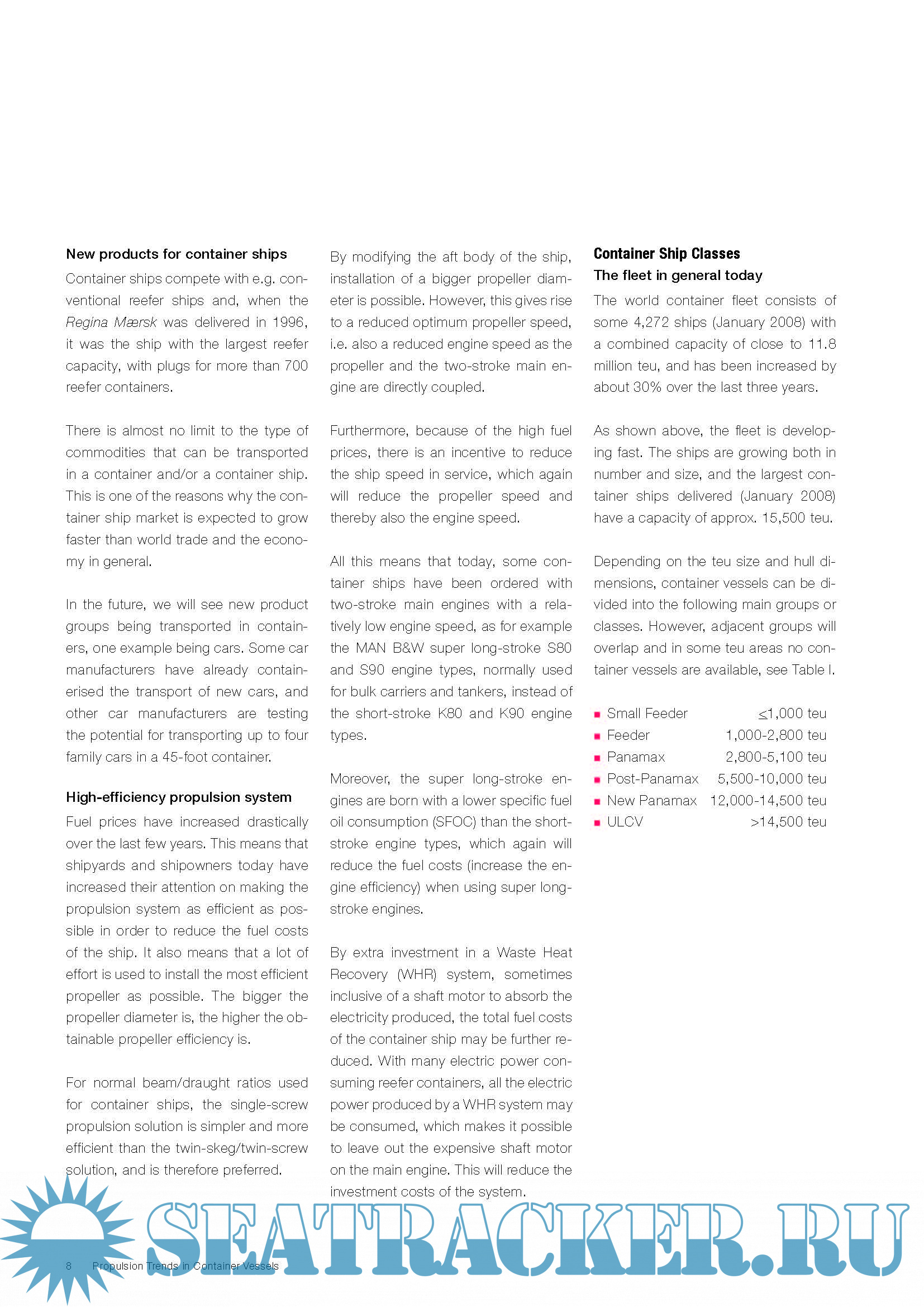 Description: The purpose of this paper – dealing with container ship sizes above 400 teu, and based on an analysis of container vessels ordered and built over the last five years – is to illustrate the latest ship particulars used for modern container ships and determine their impact on the propulsion power demand and main engine choice, using the latest MAN B&W two-stroke engine programme as the basis.