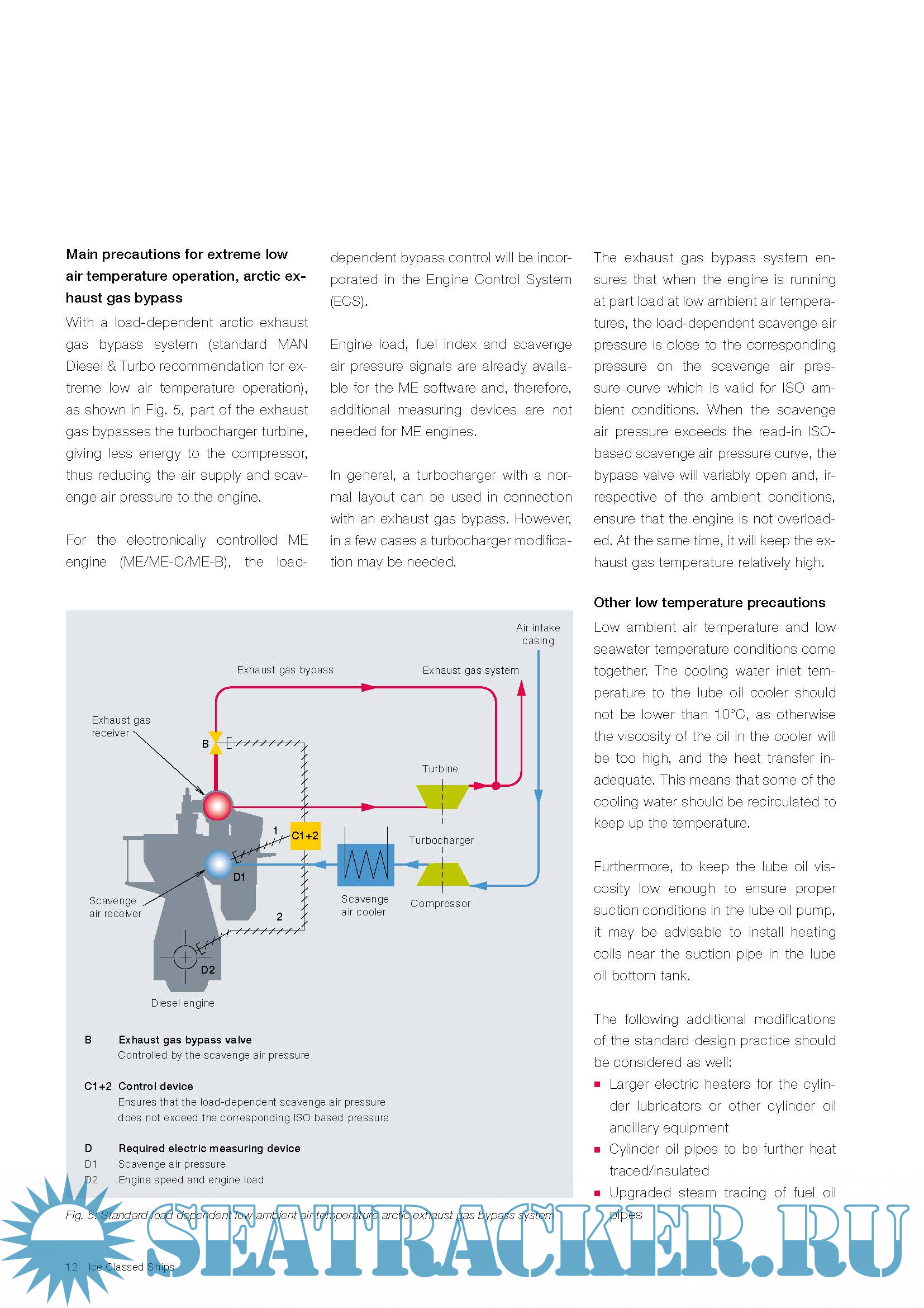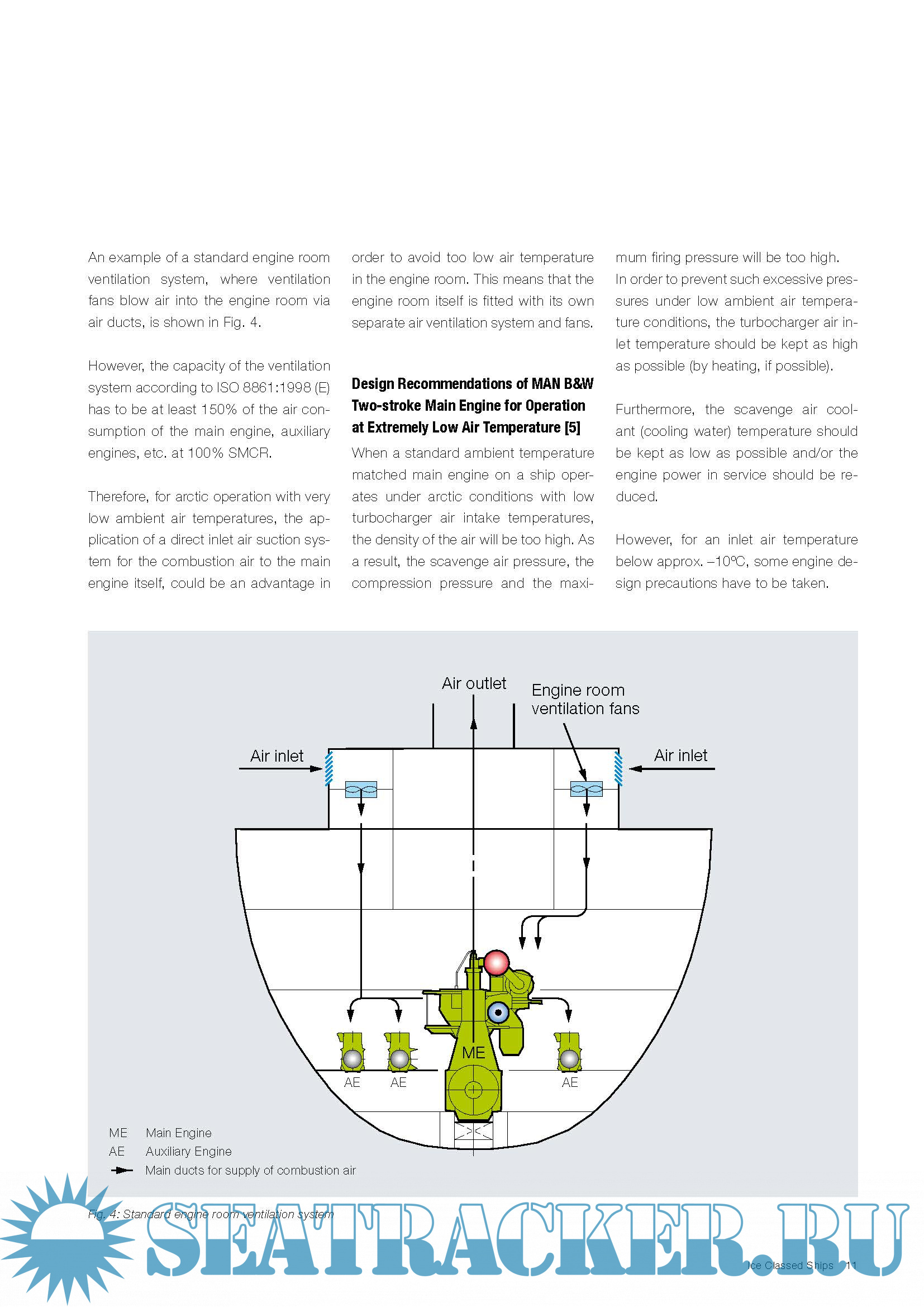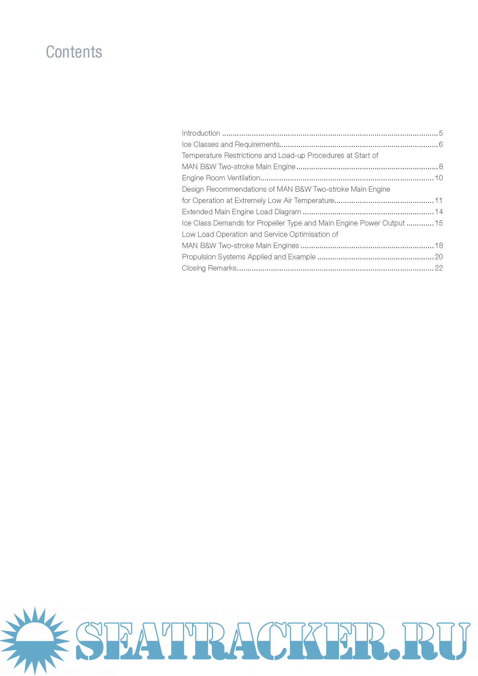 Year: 2013 Language: english Author: MAN Diesel & Turbo (Copenhagen, Denmark) Genre: Research papers Publisher: MAN Diesel & Turbo (Copenhagen, Denmark) Format: PDF Quality: eBook Pages count: 26 Description: In general, for a normal ship, the installed propulsion power of the main engine needed to obtain the required ship speed in service might also be sufficient for propulsion conditions during wintertime. However, sometimes, depending on the form and thickness of the ice, and thereby the ice class required, together with the lowest appearing ambient air temperature at winter operation, some increased demands for the main engine have to be met. The extra demands for the main engine are described in this paper.