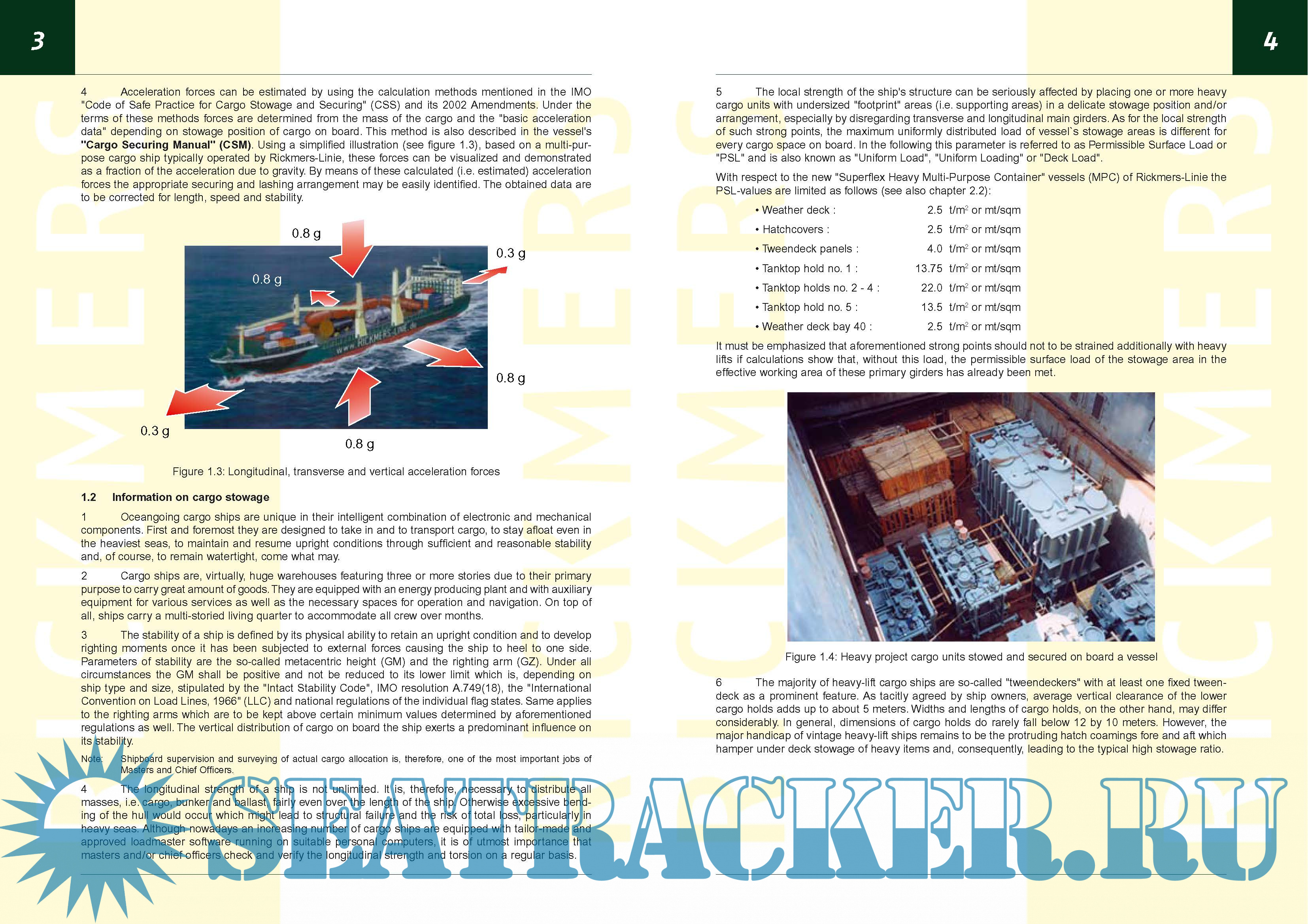 Year: 2003 Language: english Author: Rickmers-Linie GmbH & Cie. KG (Hamburg) Genre: Guide Publisher: Rickmers-Linie GmbH & Cie. KG (Hamburg) Edition: 3rd. Format: PDF Quality: OCR without errors Pages count: 52 Description: The spirit and purpose of this Standard is to inform shippers of cargo units, stevedores and supercargoes etc. about cargo handling and securing practices on board of the vessels sailing for Rickmers-Linie and to provide a specific update to masters and officers. Realizing that safety requirements do not necessarily contradict commercial aspects, the main objective of Rickmers-Linie is to increase the technical and commercial performance of marine transport by avoiding damage and loss of cargo, finally resulting in an improved safety at sea and protection of the marine environment. The Standard, in particular, provides detailed information about lifting, bedding and securing/lashing of cargo as well as the equipment used and its maintenance. The Standard further describes the cargo information to be supplied by shippers in accordance with Chapter VI, Regulation 2 of the SOLAS-Convention (see Ch 1.3) and the necessary configuration of lifting provisions, bedding areas and securing points. The desired securing point configuration and lashing scheme of the cargo corresponds with the tensile strength (MSL as per IMO) of the fixed and loose securing gear on board of the vessels and their deck lay-out.