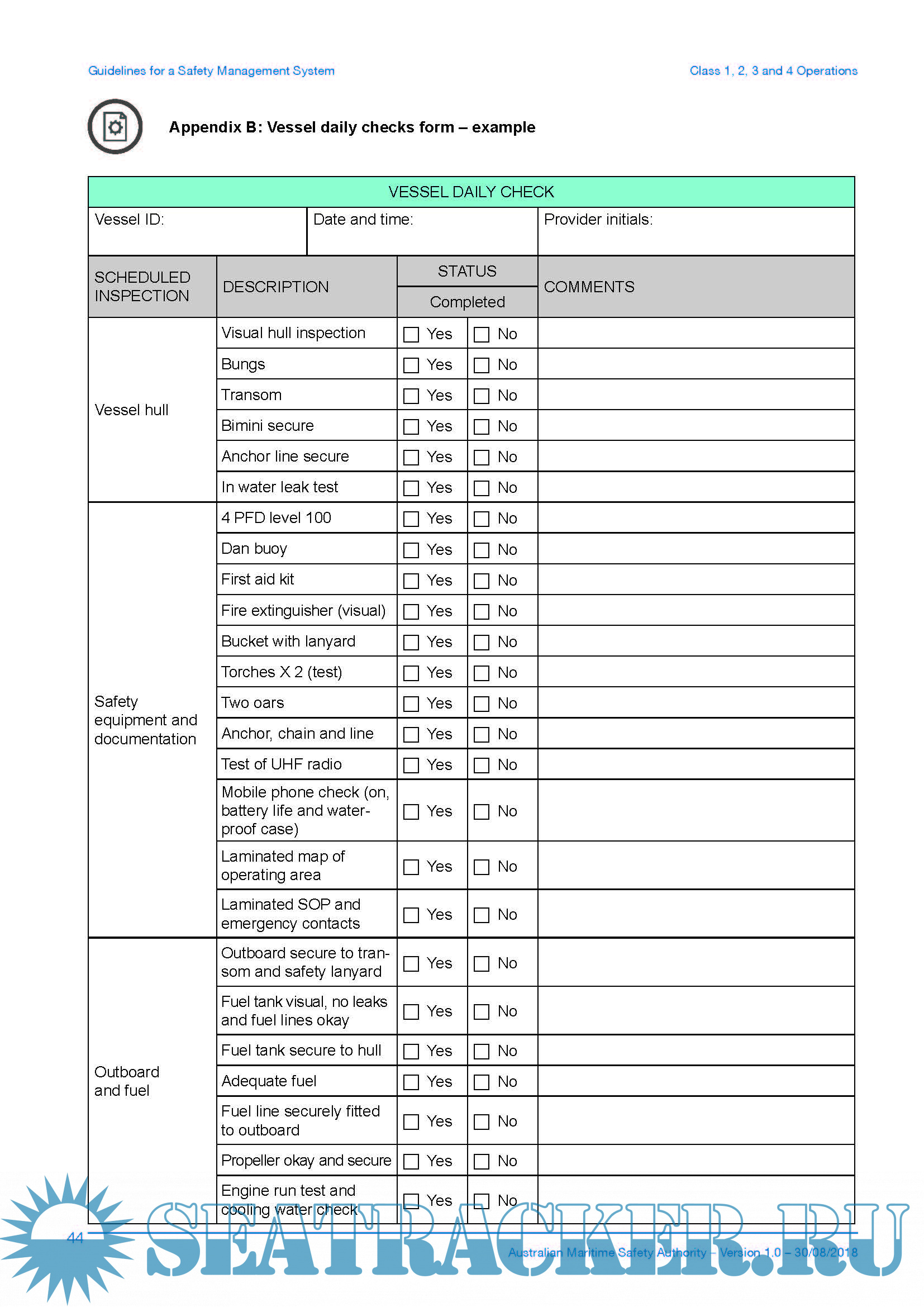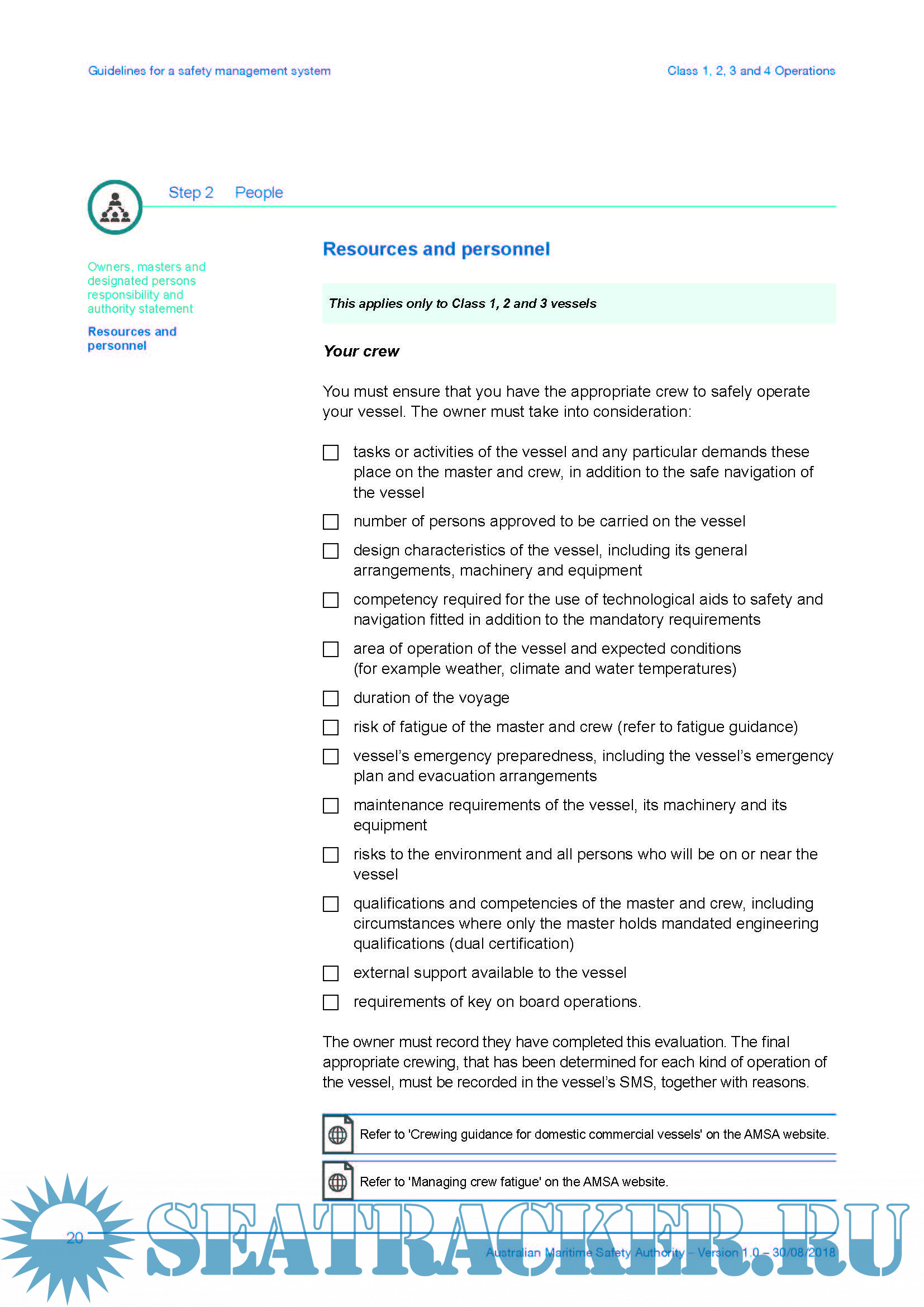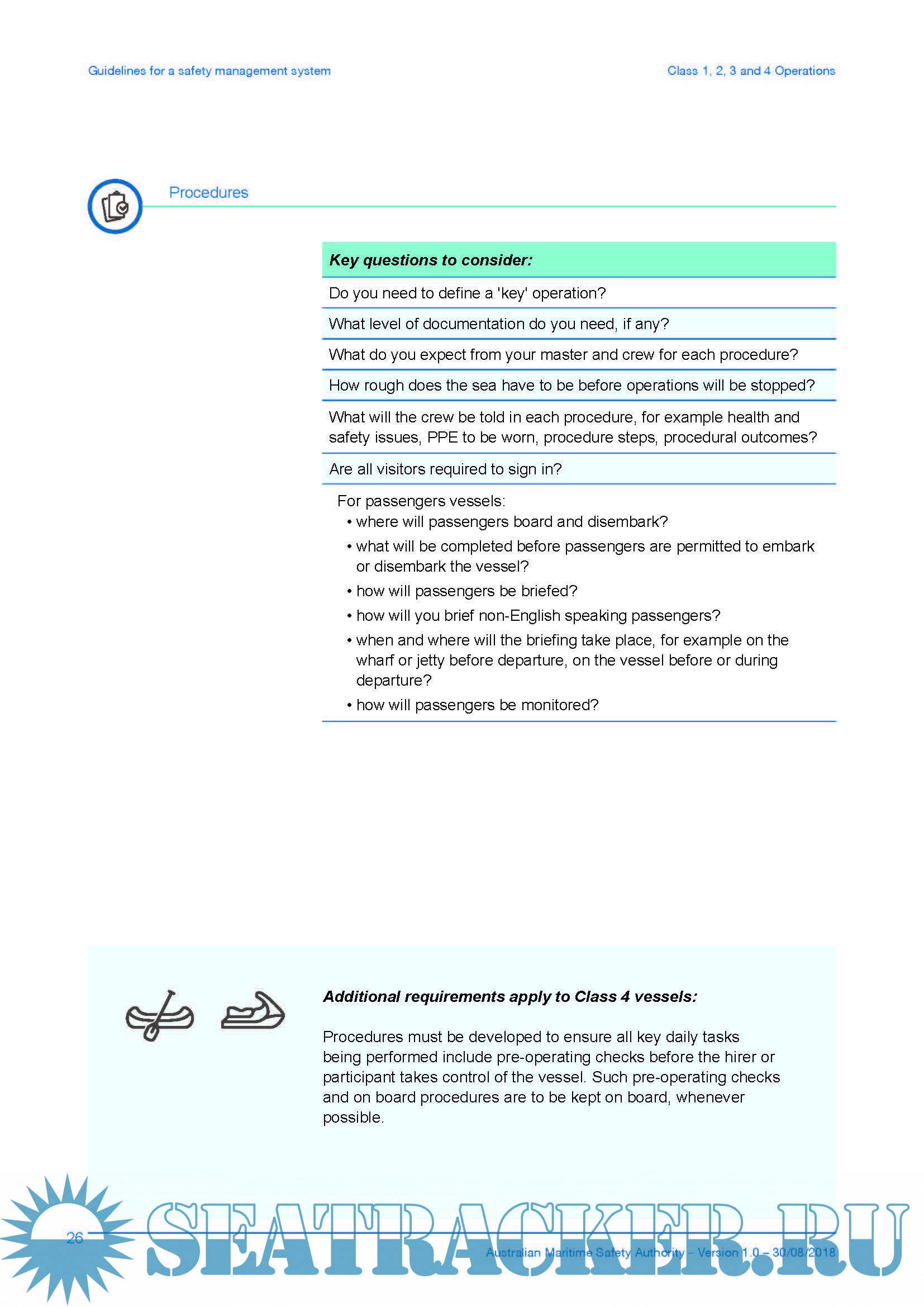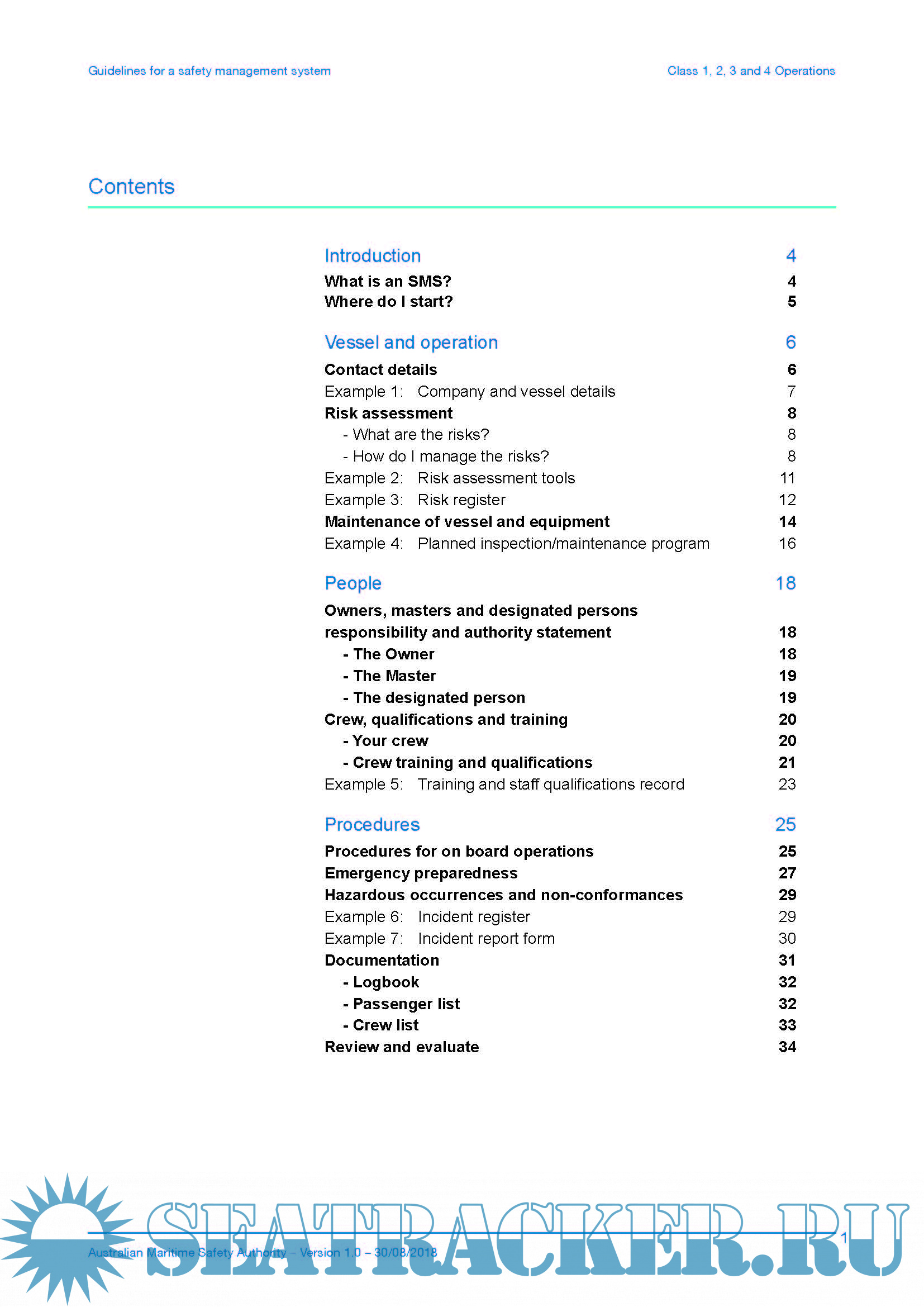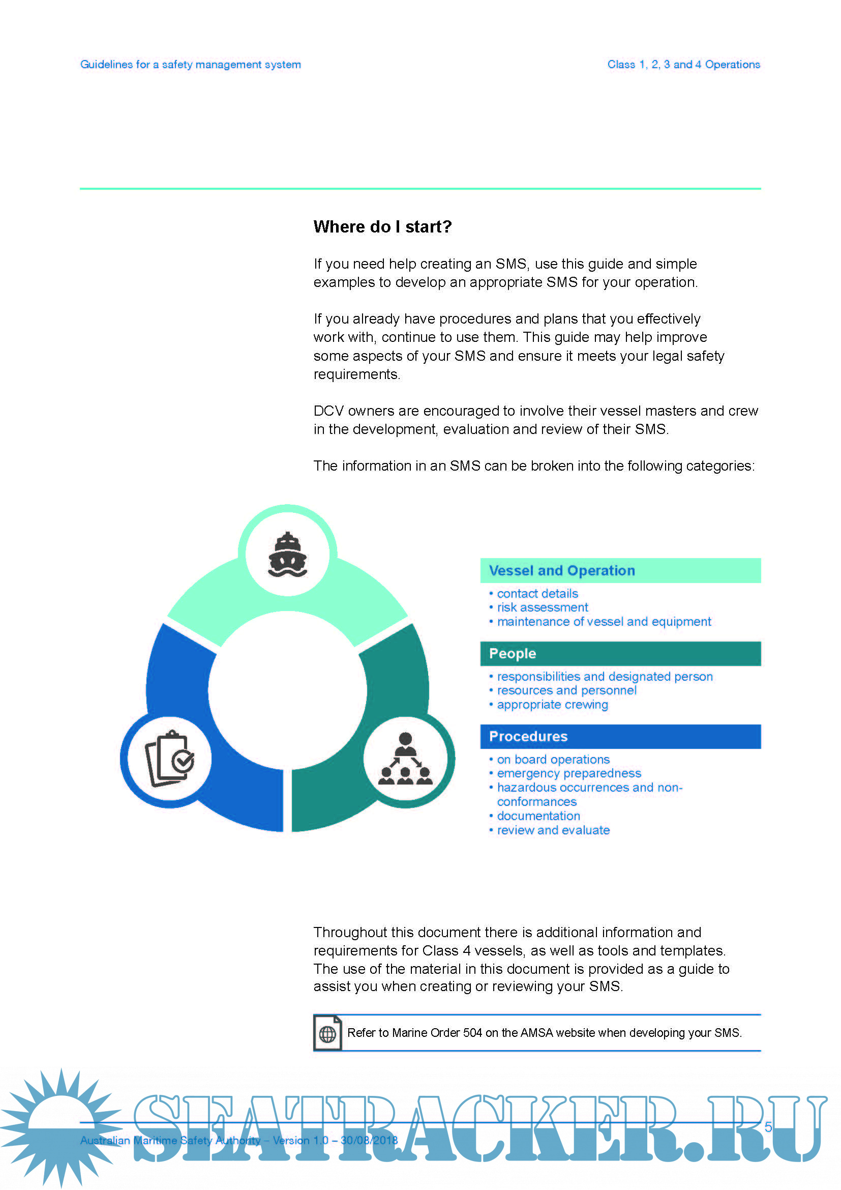 Year: 2018 Language: english Author: AMSA Genre: Guide Format: PDF Quality: eBook Pages count: 64 Description: The Australian Maritime Safety Authority (AMSA) works with domestic commercial vessels (DCV) to ensure they operate safely through the implementation and maintenance of a safety management system (SMS) for each vessel. Scope These guidelines provide information and examples to help DCV owners and operators develop an SMS. Each vessel’s SMS must be tailored to reflect the size, complexity and area of opereation, as well as the risks unique to their vessel and its operation. Application This user guide applies to all owners and operators of DCVs who are required by law to implement and maintain an SMS, including those under grandfathered arrangements and those that are exempt from needing a certificate of operation.