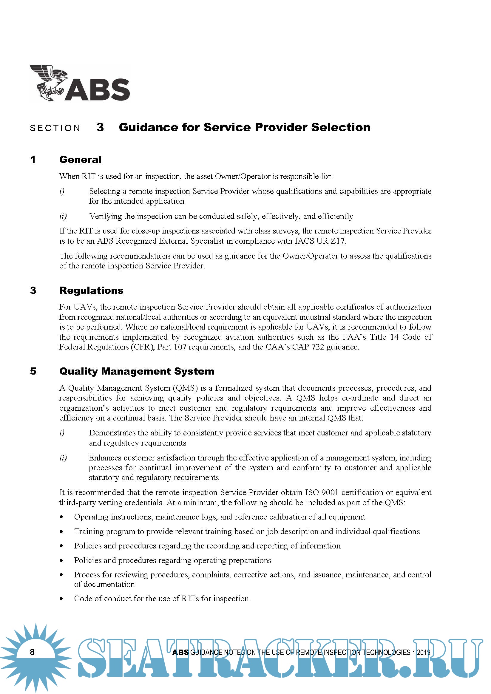 Year: 2019 Language: english Author: ABS Genre: Guide Format: PDF Quality: eBook Pages count: 37 Description: There are several different remote inspection technologies (RITs) which can assist the attending Surveyor in evaluating the condition of the structure. Remote Inspection Technologies (RITs) enable a Remote Inspection Vehicle (RIV) to provide access for the inspection of structures. Some common types of RIV include Unmanned Aerial Vehicles (UAVs), Remotely Operated Underwater Vehicles (ROVs), and Robotic Crawlers. These RITs also provide a benefit to the asset Owner/Operator by reducing operational intrusiveness. These Guidance Notes offer best practices for class surveys and non-class inspections carried out using RITs. These best practices include recommendations and guidance on applications of RITs, qualification and proficiency of the remote inspection Service Providers, Remote Inspection Vehicle (RIV) operation, data handling and data analysis. These best practices are intended to facilitate a safer, more effective and efficient survey.