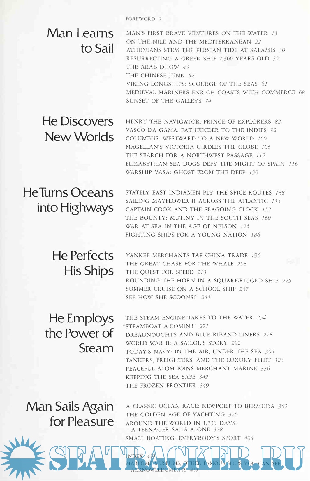 Learn how pharaohs built their ships; how the steering oar evolved into the rudder; how mariners navigate and seamen live under sail and steam. Glimpse ships of the future, and the undersea world revealed by daring oceanographers. Let yachtsman Carleton Mitchell show you how to choose, sail, and care for your boat —how to be skipper as well as armchair voyager.