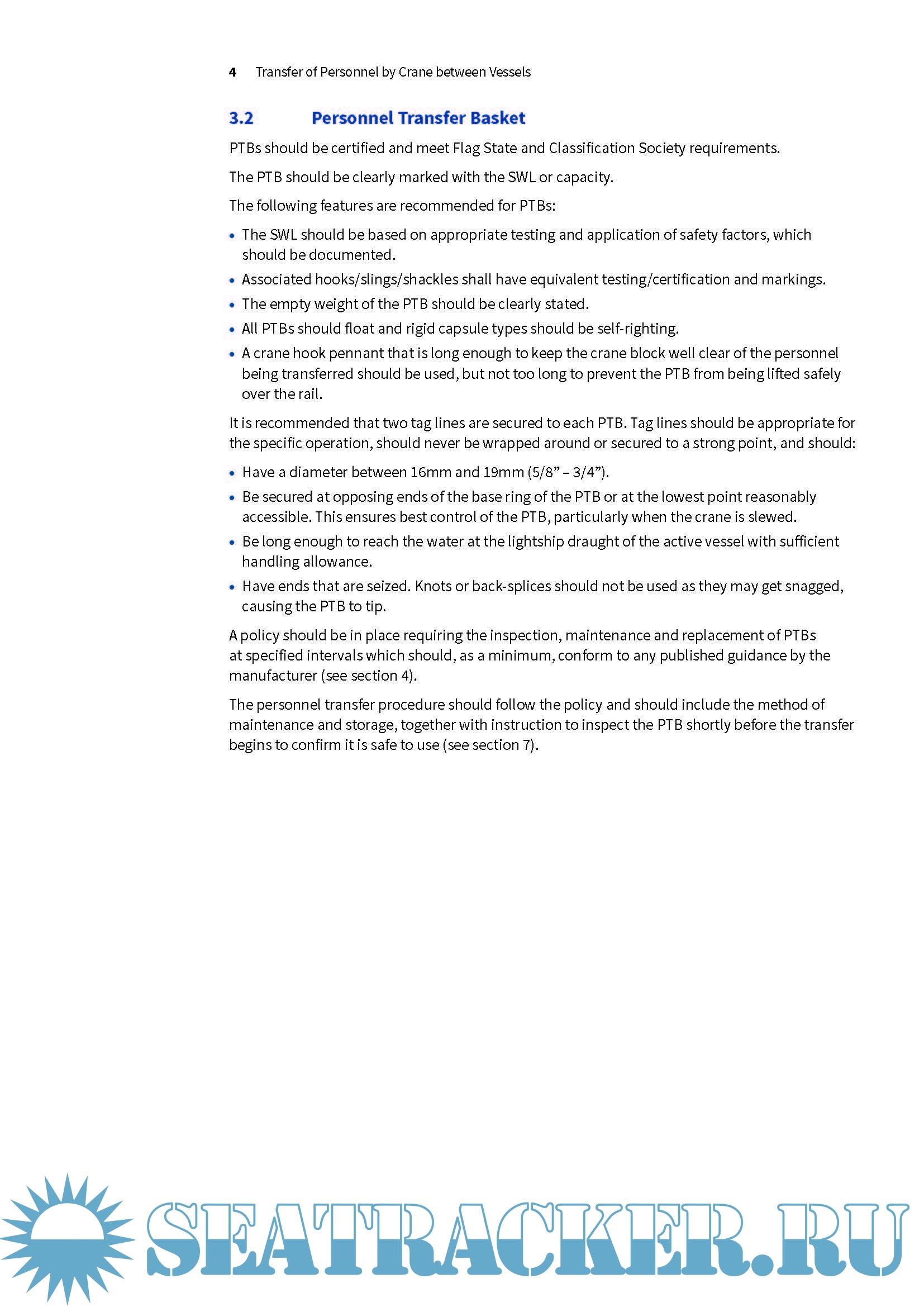 Description: This information paper is intended to help vessel operators and owners, Masters, officers, Marine Superintendents and Mooring Masters evaluate the risks associated with the transfer of personnel by a vessel’s onboard crane. The paper contains recommendations on equipment and good operating practices that will enhance the overall safety of personnel transfer operations. It is not a set of rules and if more stringent international, national or local regulations apply they must always take precedence.