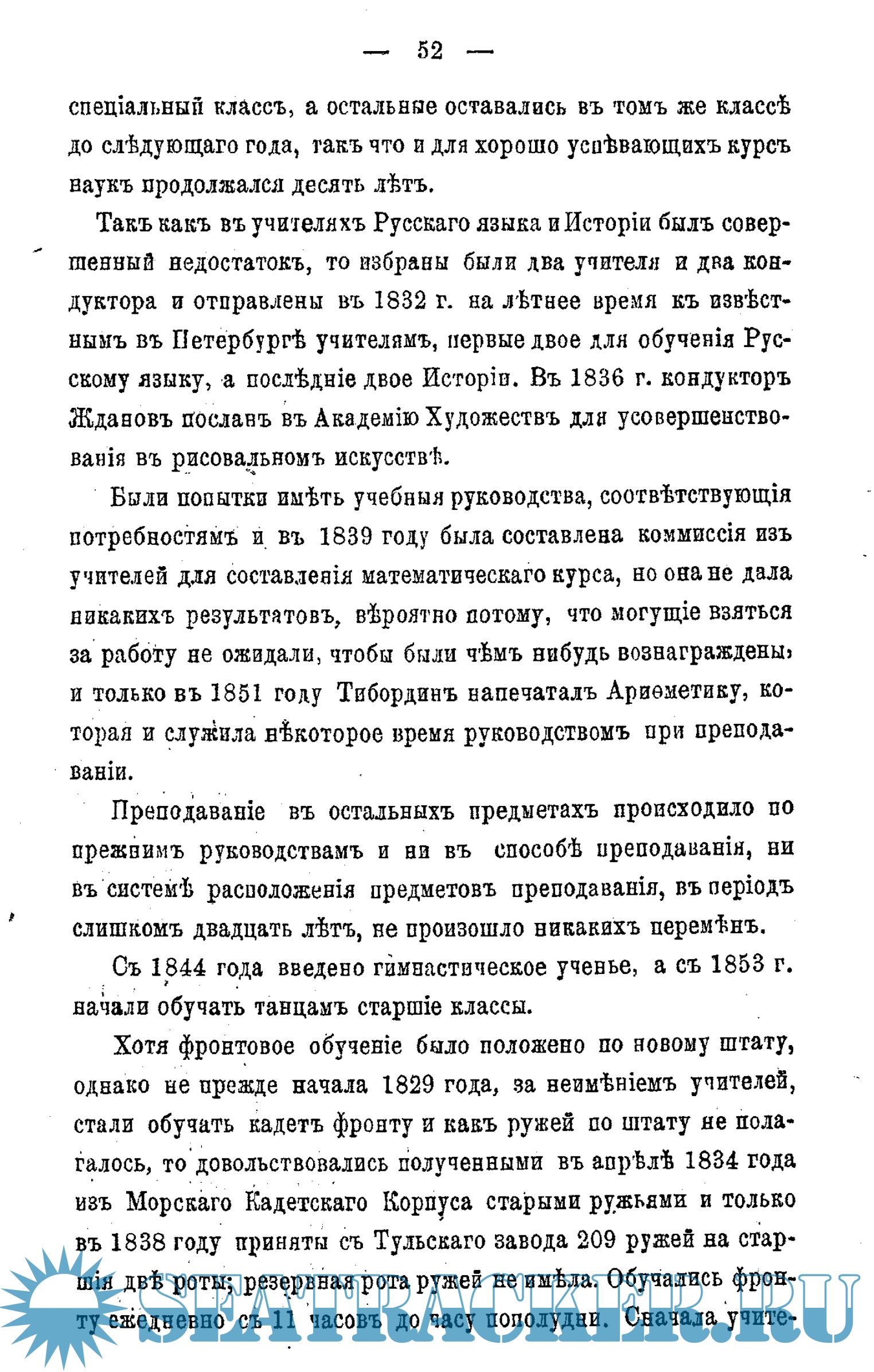 Описание: "Гениальный основатель Русского флота Император Петр Великий, Создавая флот, ясно понимал, что сила его заключается не только в числе и хорошем сильном вооружении кораблей, но и в искусных, знающих людях, призванных к управлению мореходными судами. В числе этих лиц штурмана имеют обязанность следить за путесчислением корабля и направлять его к безопасному плаванию - обязанность весьма важная и потому Император принимал весьма деятельные меры, чтобы приобрести людей для управления судами необходимых и как таких в нашем отечестве, при отсутствии мореходных понятий, не находилось, то Он обращался в первое время за границу и оттуда приглашал как штурманов, так и других морских офицеров. Но такой порядок не мог долго продолжаться и ставил нас в слишком большую зависимость от иностранных держав. Поэтому надобно было иметь свои домашние источники, из которых могли пополняться места, требующие мореходных познаний. Еще в 1698 году Царь в бытность свою в Лондоне приказал отыскать хорошего преподавателя математики и морских наук, а 14 января 1701 года последовал Высочайший указ об учреждении в Москве школы "Математических и Навигацких, то есть мореходных хитростно искусств учения". Известно, что эта школа имела название Навигацкой школы и заменяла все нынешние высшие учебные заведения."