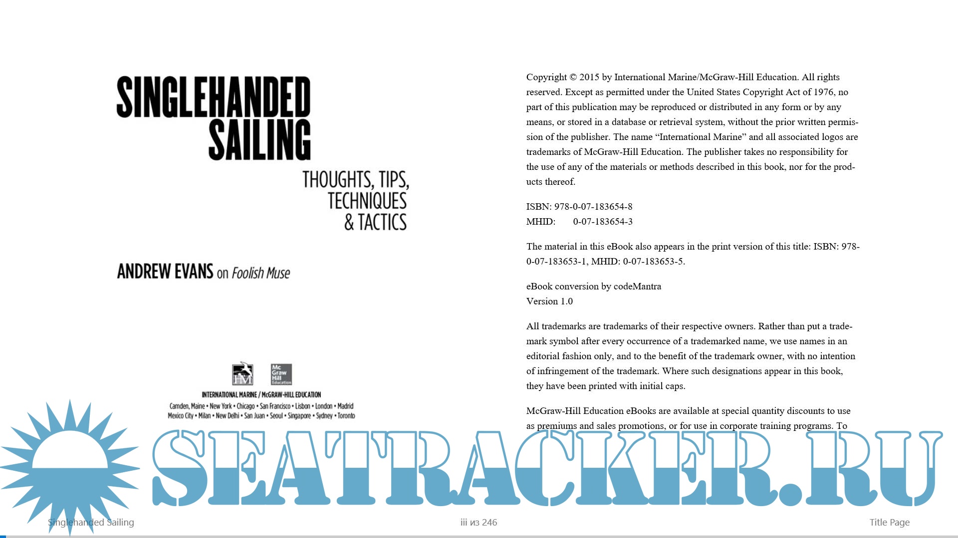 Year: 2015 Language: english Author: Andrew Evans Genre: Guide Publisher: McGraw-Hill Education ISBN: 978-0-07-183654-8 Format: EPUB Quality: eBook Pages count: 246 (depends upon the screen resolution) Description: "It takes thousands of hours of sailing to get the kind of knowledge contained in this book." -- from the Foreword by Bruce Schwab The ONLY bible for how to sail your boat fast, safe, and alone Solo sailing is within any sailor's grasp with a little forethought--and this essential guide. Got a 35-foot sailboat? No problem. Is the wind blowing 20 knots? No problem. Are you racing offshore overnight? Even better. Singlehander Andrew Evans learned the hard way how to sail and race alone--with lots of mishaps, including broaches and a near tumbling over a waterfall--and in Singlehanded Sailing he shares the techniques, tips, and tactics he has developed to make his solo sailing adventures safe and enriching. PS See my other releases: https://seatracker.info/tracker.p...id=54420#results