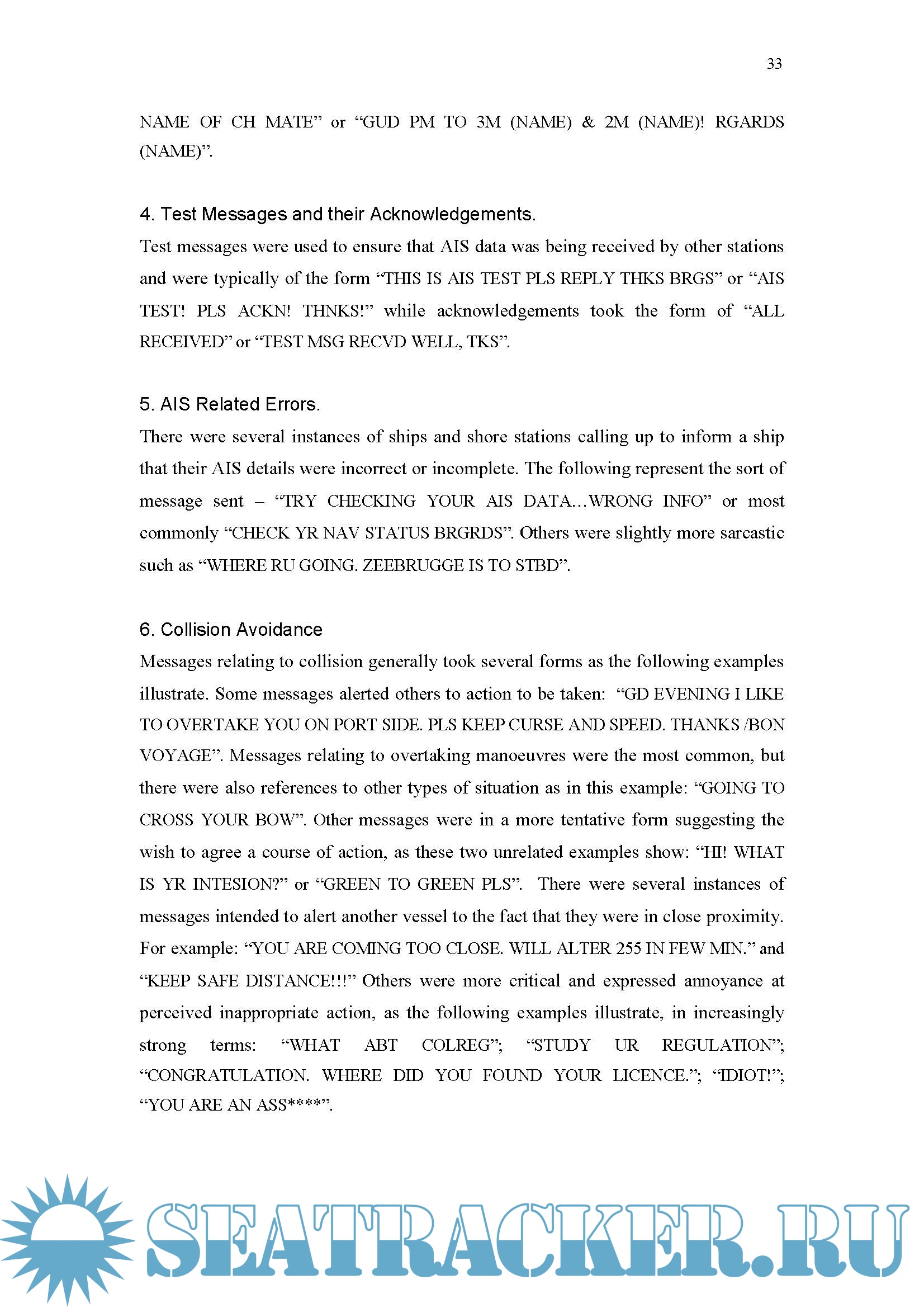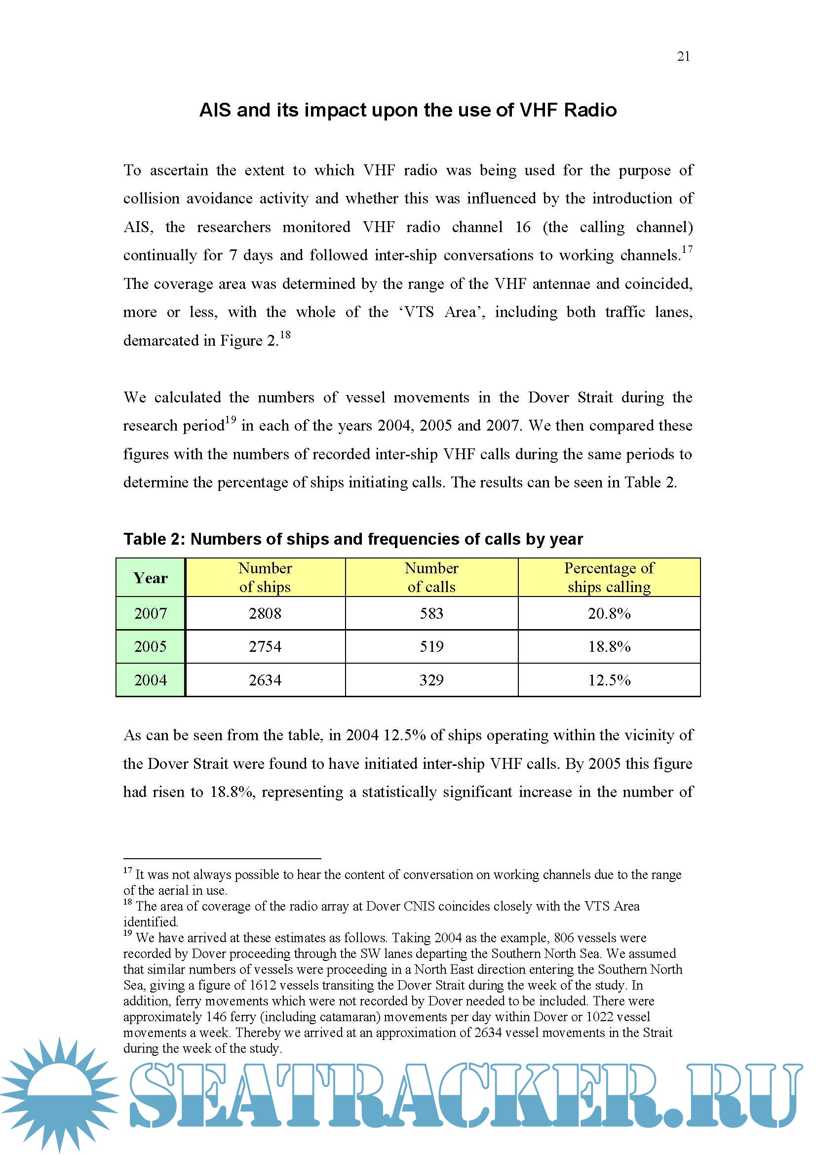 The report is based on data collected at three time points over a four-year period (October 2004, October 2005 and October 2007). The report indicates the levels of errors in the use of AIS and how these levels varied over time. It also considers the extent to which AIS appears to encourage the “improper” use of VHF radio for collision avoidance and the implications of this for training. The use of VHF radio to negotiate collision avoidance between ships has long been held to be a problem by many agencies concerned with navigation, such as, the UK Maritime Coastguard Agency (MCA).