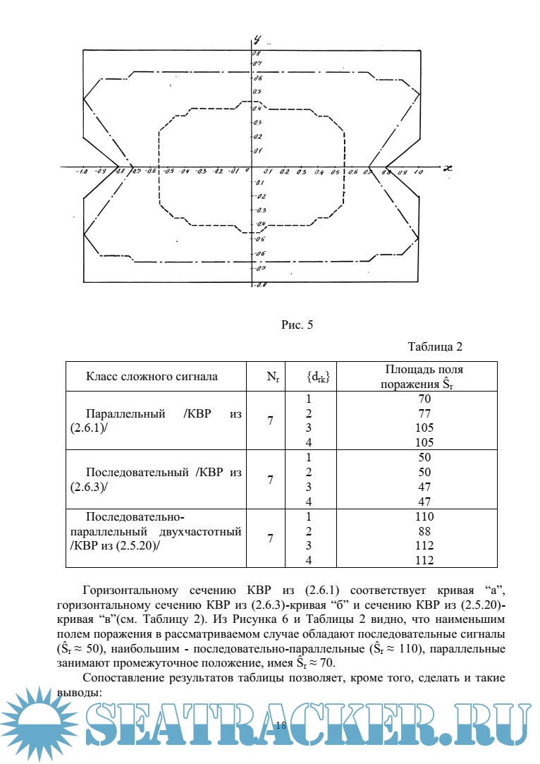 - задача синтеза сложных (широкополосных) сигналов по критерию минимума площади поля поражения сигналов в условиях воздействия взаимных (ретранслированных или узкополосных) помех;