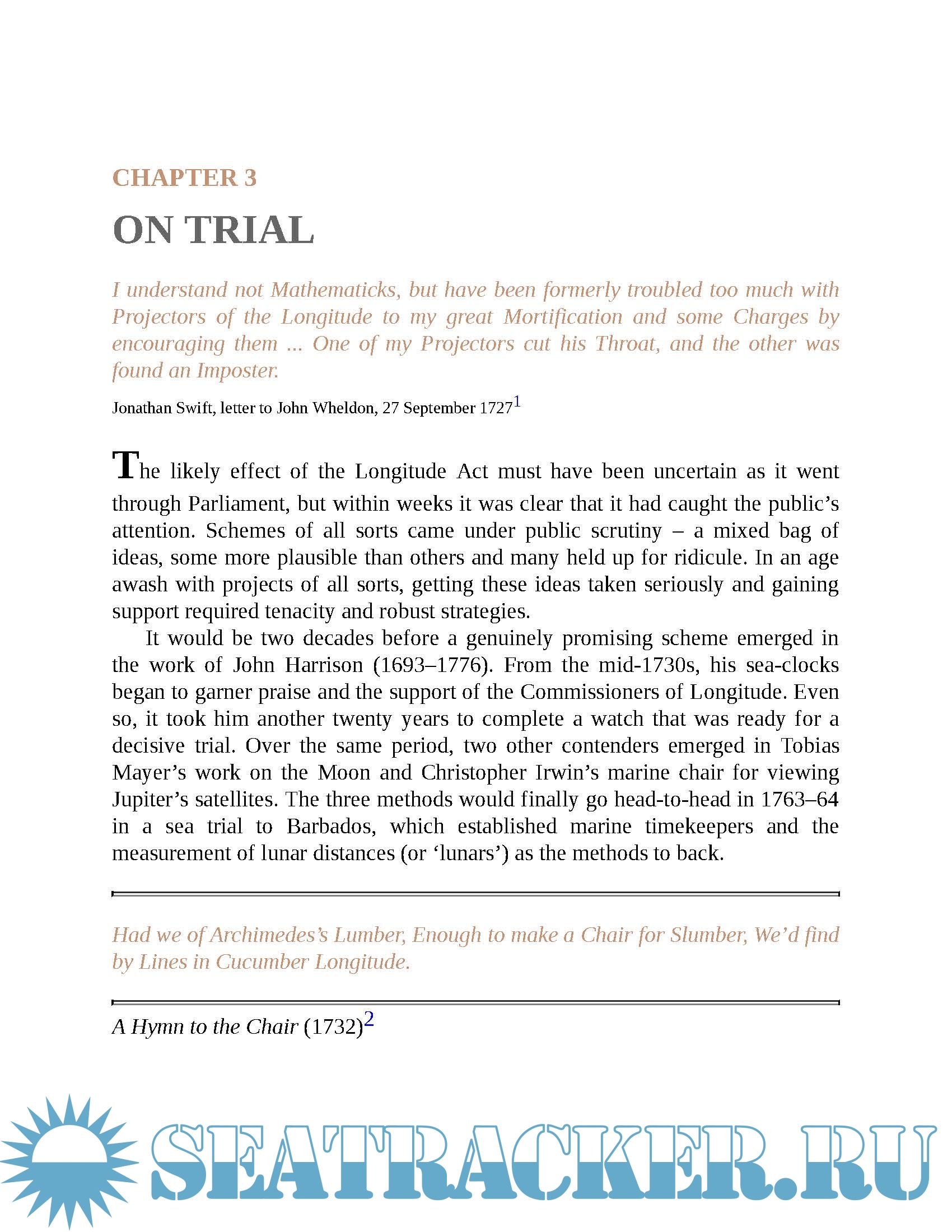 The likely methods and familiar problems were neatly summarised by Isaac Newton. Longitude at sea could be calculated with an accurate timepiece, which shipboard motion and variations of heat and cold had thus far made impossible; by monitoring Jupiter’s satellites, which the size of the telescopes required rendered impracticable; by the location of the moon, which only provided accuracy up to three degrees; and by ‘Mr Ditton’s project’, which involved having moored vessels fire shells 6,440 feet into the air at set times, allowing other ships to take bearings – an idea that caused hilarity at the time, although it seems ingenious enough.