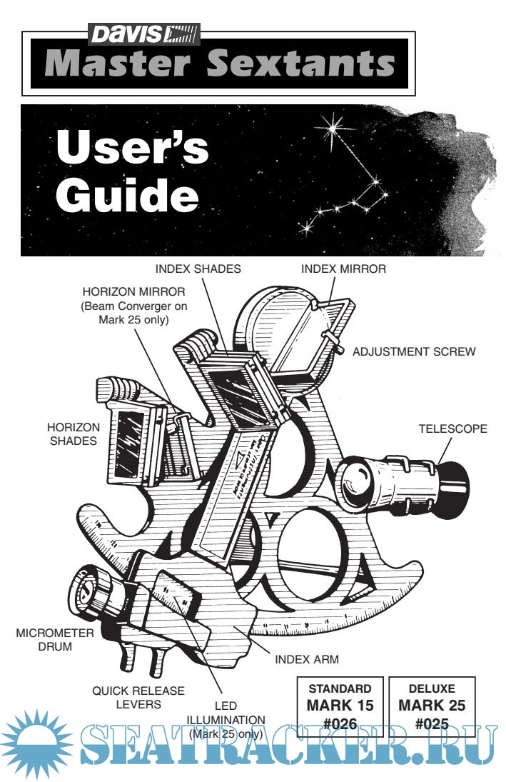 Year: 2008 Language: english Author: Davis Instruments Genre: Guide Format: PDF Quality: eBook Pages count: 24 Description: This booklet gives the following information about your Davis Sextant: • Operating the sextant • Finding the altitude of the sun using the sextant • Using sextant readings to calculate location • Other uses for the sextant