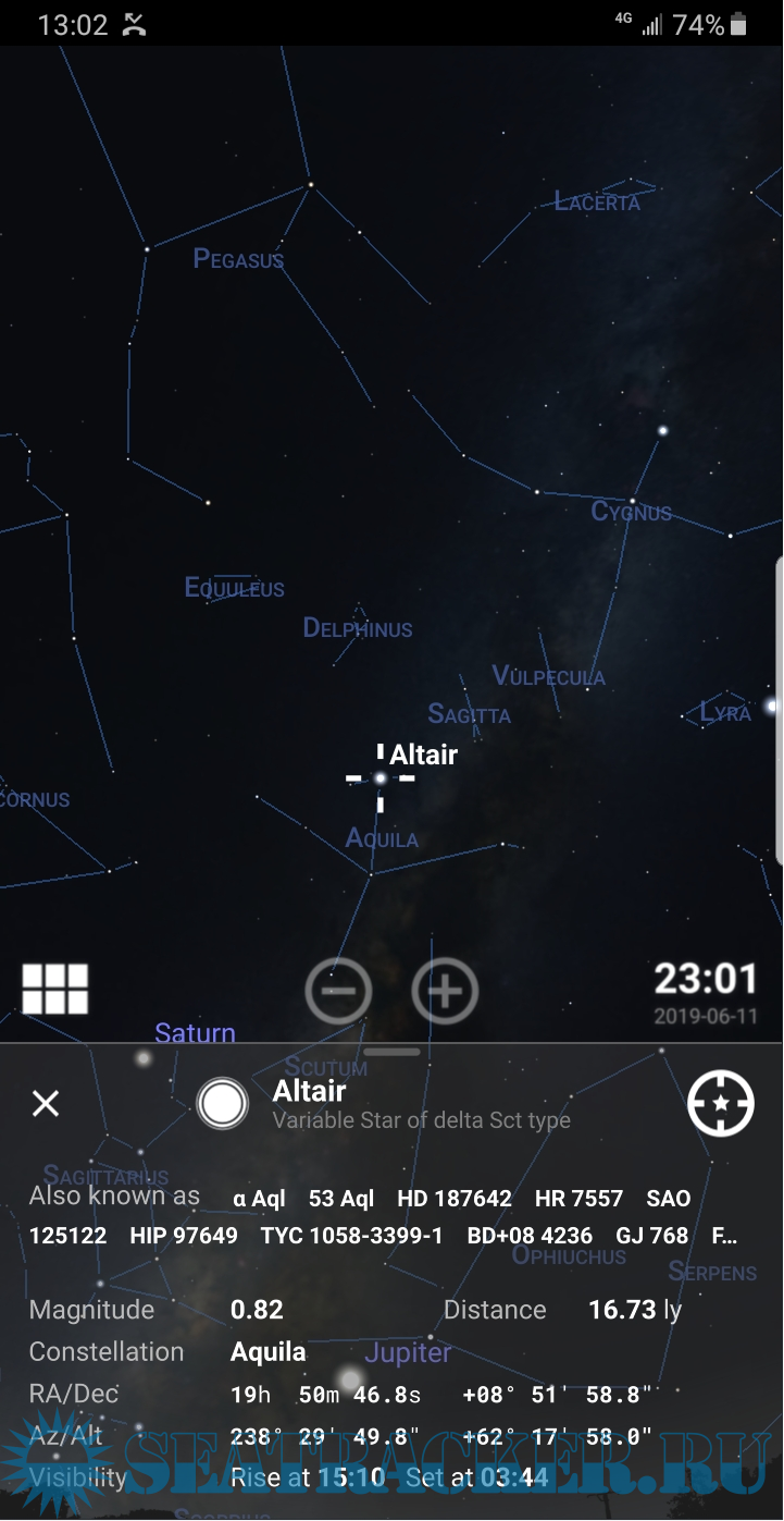 • информация о небесных светилах (прямое восхождение, склонение, азимут, высота...)