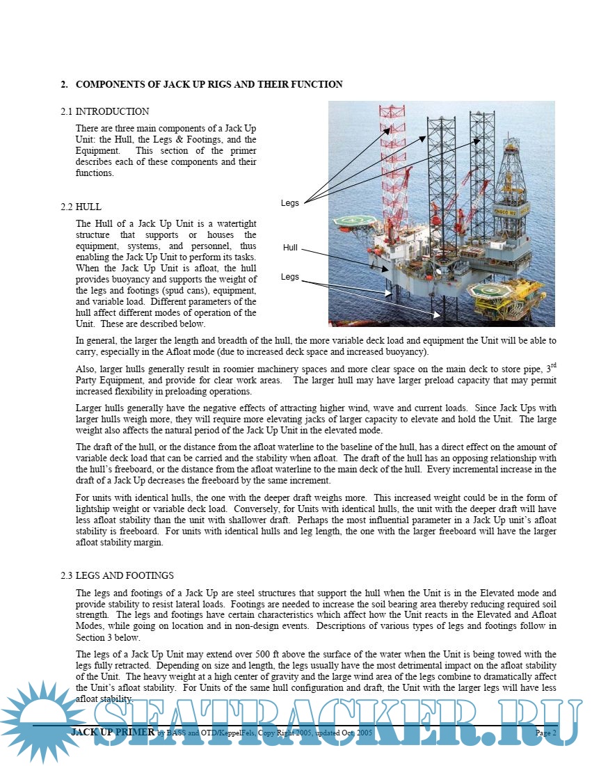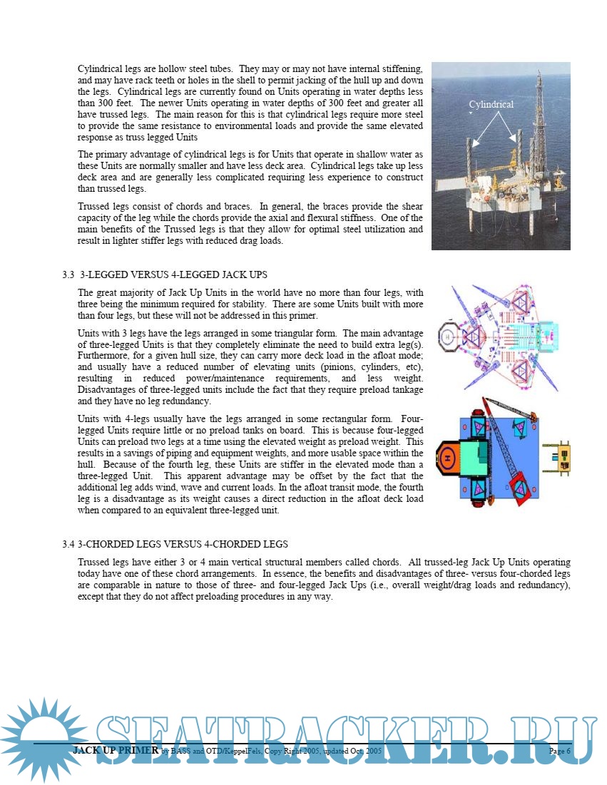 Year: 2005 Language: english Author: J.Vazquez, R.Michel Publisher: Keppel FELS and Keppel Offshore and Marine Format: PDF Quality: eBook Pages count: 24 Description: Jack Up Units are complex structures used offshore in many modes of operation. When using a particular Unit at a givensite, it is important to be aware and understand the basics behind the different designs under different conditions. The focusof this primer is a simplified discussion of the various sensitivities of Jack Ups while in the different modes of operation. Itis hoped that by increasing the understanding of how Jack Ups work and behave as well as the sources of the loads actingon them, those making decisions with limited information willbe better equipped to respond toincidents and reduce theiroccurrence and/or consequences. Though there are many variations in design and purposes for Jack Ups, this primerfocuses many of these discussions on three-legged Units used for drilling. The primer starts by presenting somebackground and discussions of the basics of Jack Up components analyses. This is followed by sections on Jack Up Components and Configurations, modes ofoperation, differences between Classapproval and site specific assessment, basic analysis, and a discussion of competing aspects of Jack Up design.