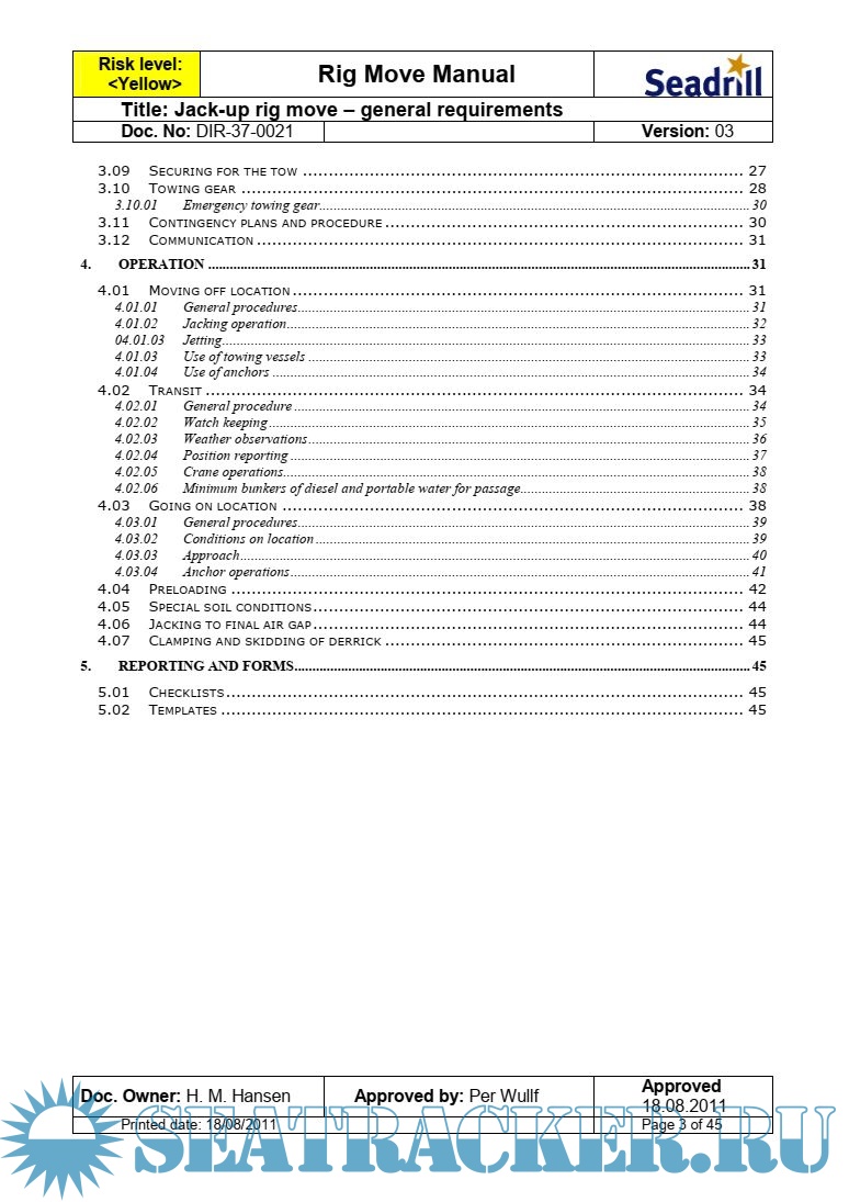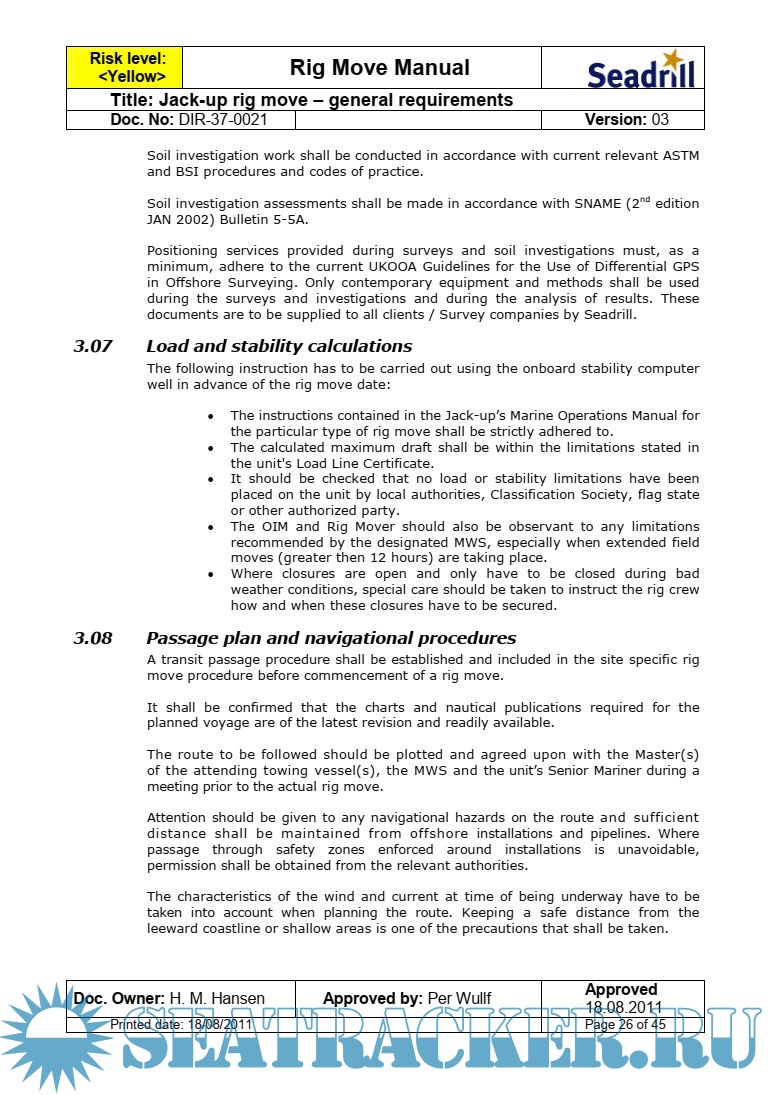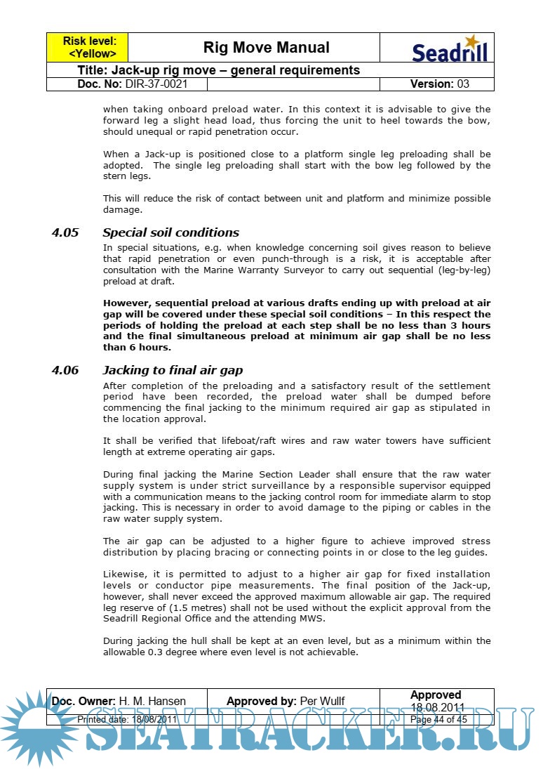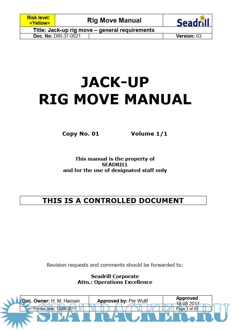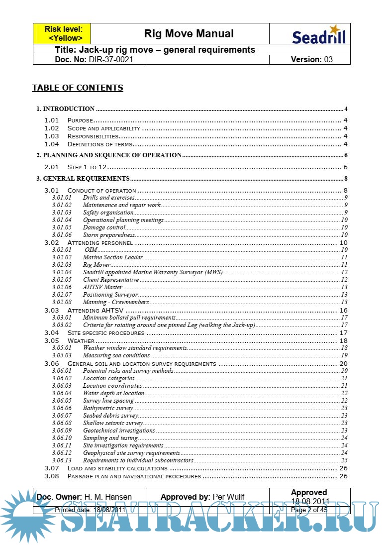 This rig move manual is issued by Seadrill Corporate and shall be considered as aset of minimum requirements. In addition to these requirements, all international and local country rules and regulations shall be implemented and included in the site specific rig move and preload procedures issued for each rig move operation.