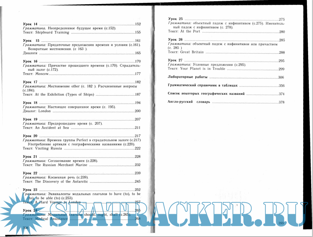 Год выпуска: 2003 Язык: русский Автор: Китаевич Б.Е., Сергеева М.Н., Каминская Л.И., Вохмянин С.Н. Жанр: Учебное пособие Издательство: Москва: Росконсульт ISBN: 5-94976-004-2 Формат: PDF/DjVu/MP3 Качество: Отсканированные страницы Количество страниц: 400 Описание: Цель учебника — научить активному владению языковым материалом, чтению и переводу со словарем литературы средней трудности по об- щебытовой и общеморской тематике, ведению беседы на английском языке в пределах тем, предусмотренных программой. В учебнике имеется англо-русский словарь. Книга является шестым, перерабо- танным изданием. Учебник предназначен для учащихся высших и средних учебных заведений водного транспорта.