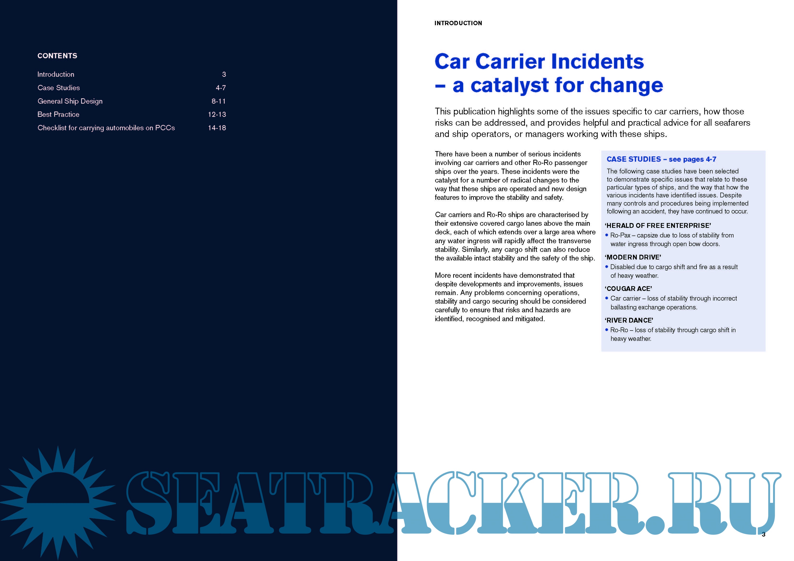 Car carriers and Ro-Ro ships are characterised by their extensive covered cargo lanes above the main deck, each of which extends over a large area where any water ingress will rapidly affect the transverse stability. Similarly, any cargo shift can also reducethe available intact stability and the safety of the ship.