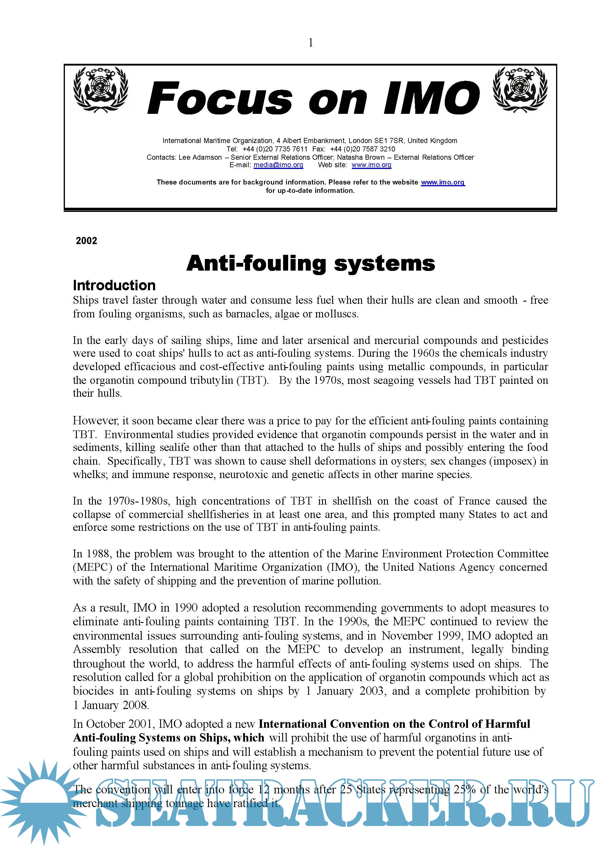 Description: In October 2001, IMO adopted a new International Convention on the Control of Harmful Anti-fouling Systems on Ships, which will prohibit the use of harmful organotins in antifouling paints used on ships and will establish a mechanism to prevent the potential future use of