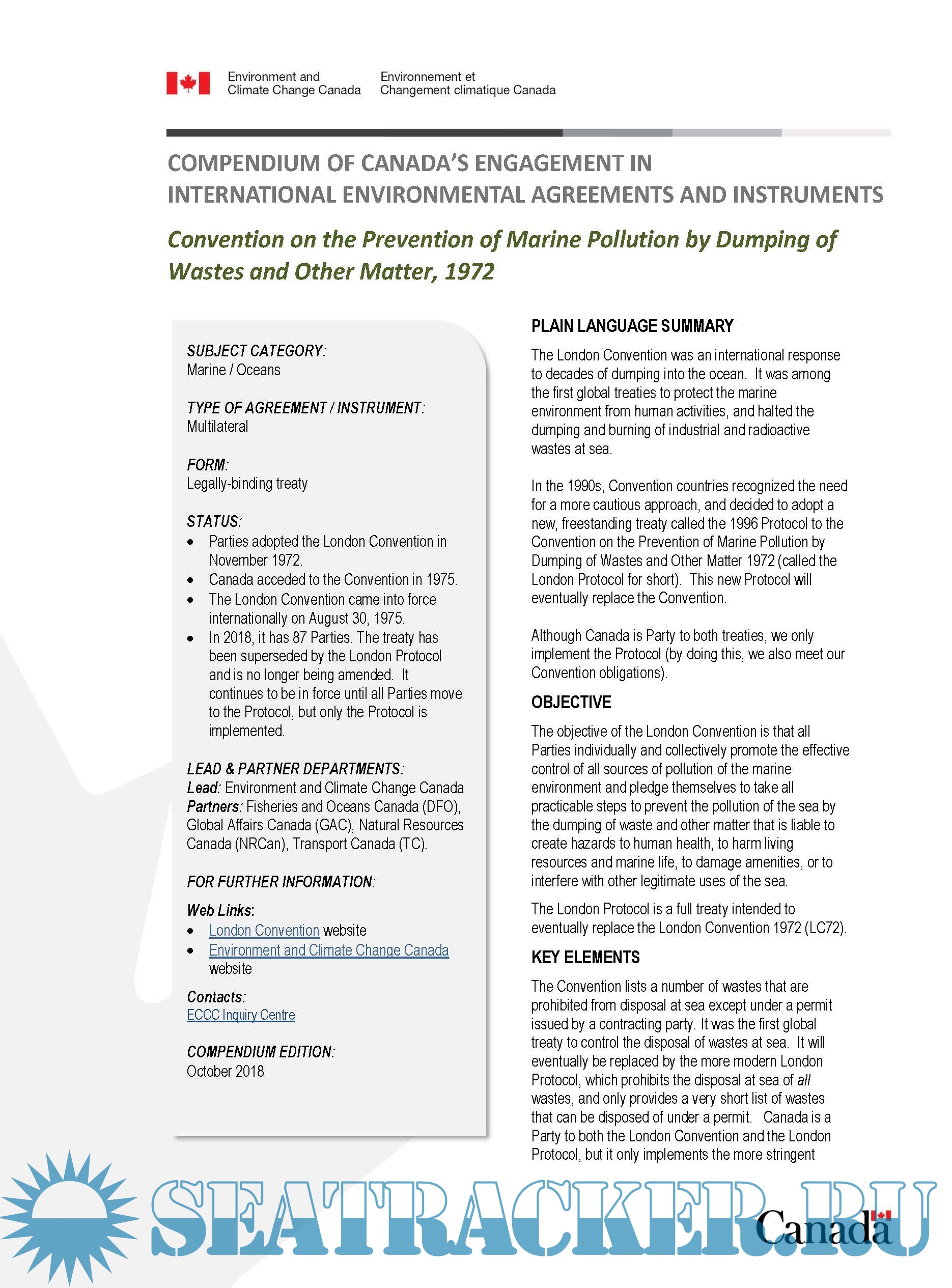 6) Convention on the Prevention of Marine Pollution by Dumping of Wastes and Other Matter, 1972 (Canada 2018 compendium) –