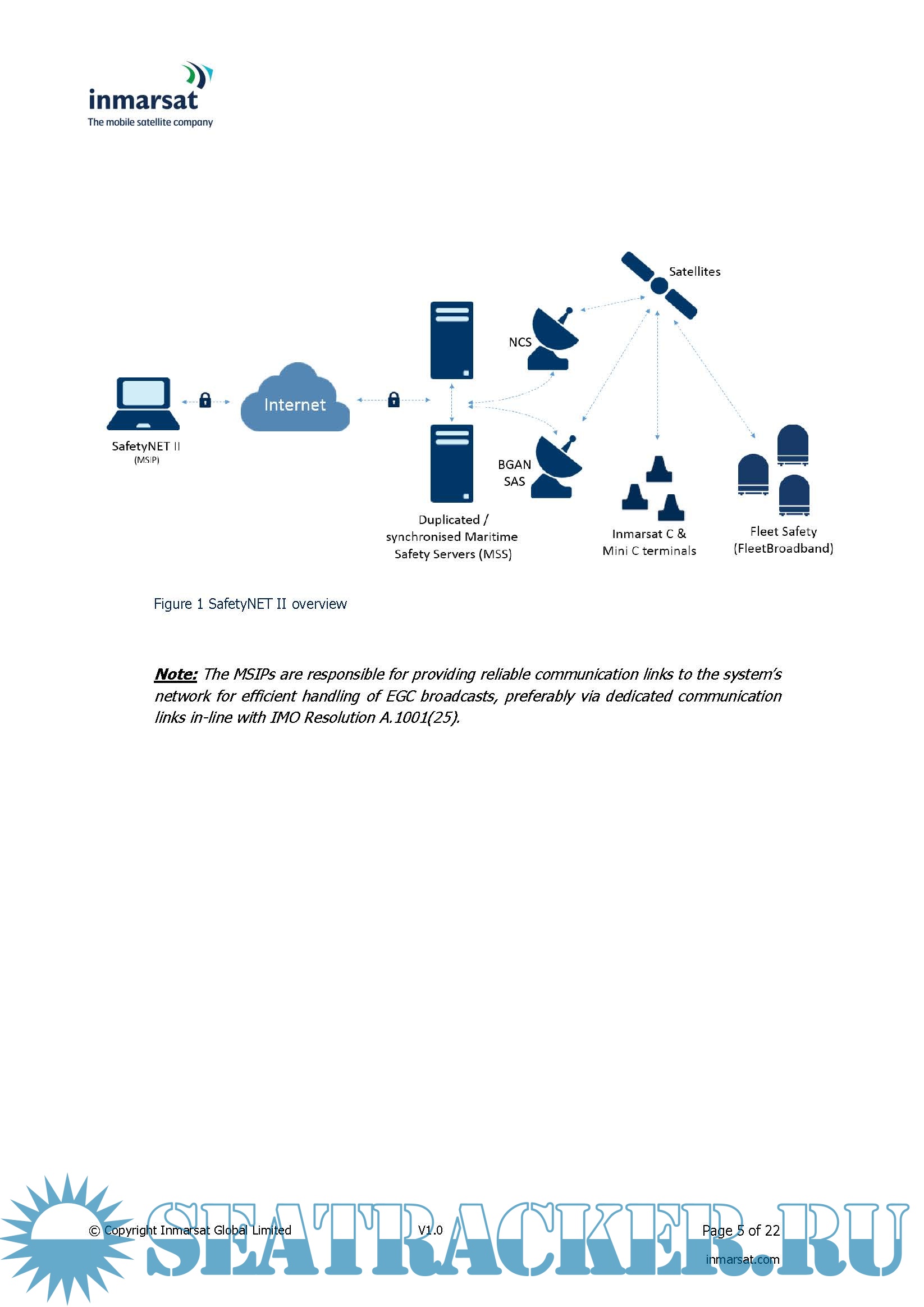 Description: This document provides a description of the SafetyNET II system, which is part of the Inmarsat Maritime Safety Services offering. This Handbook is intended for Maritime Safety Information Providers (MSIPs) and provides a high-level description of the features available. For more in-depth information on EGC broadcasts and the SafetyNET infrastructure, please refer to the MSC.1/Circ.1364/Rev.1 International SafetyNET Manual as amended.