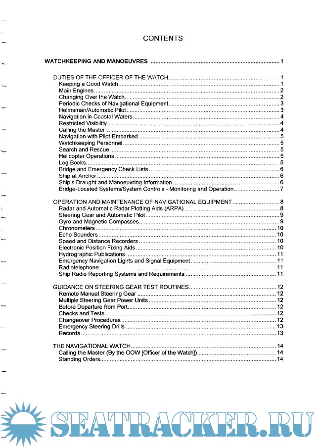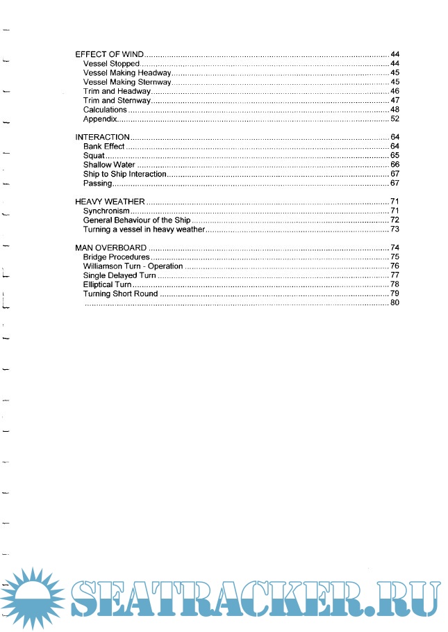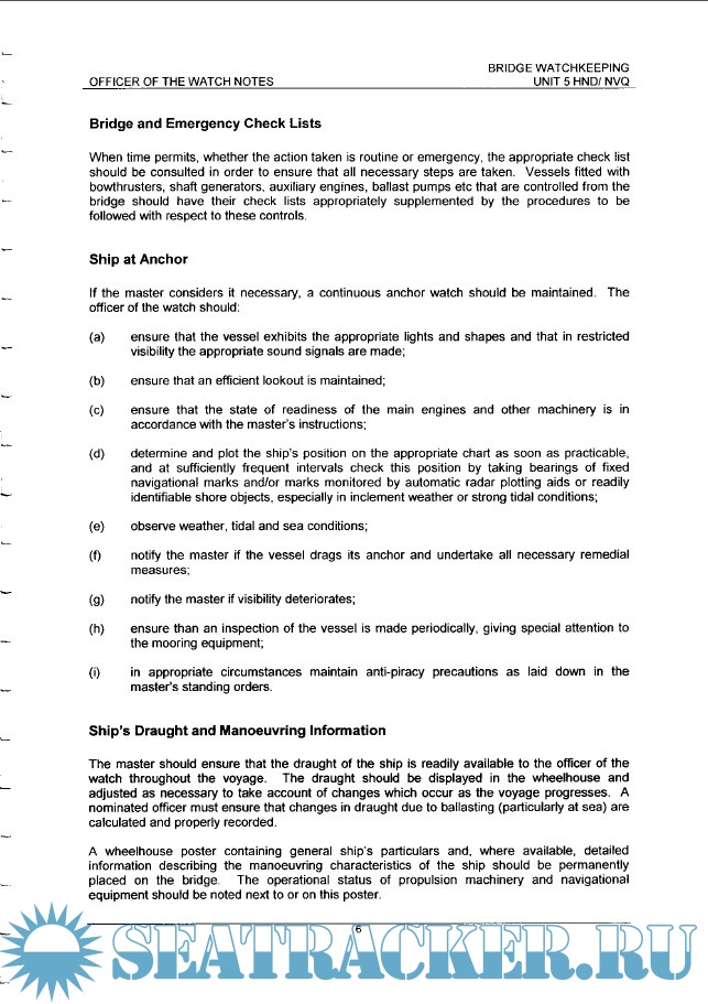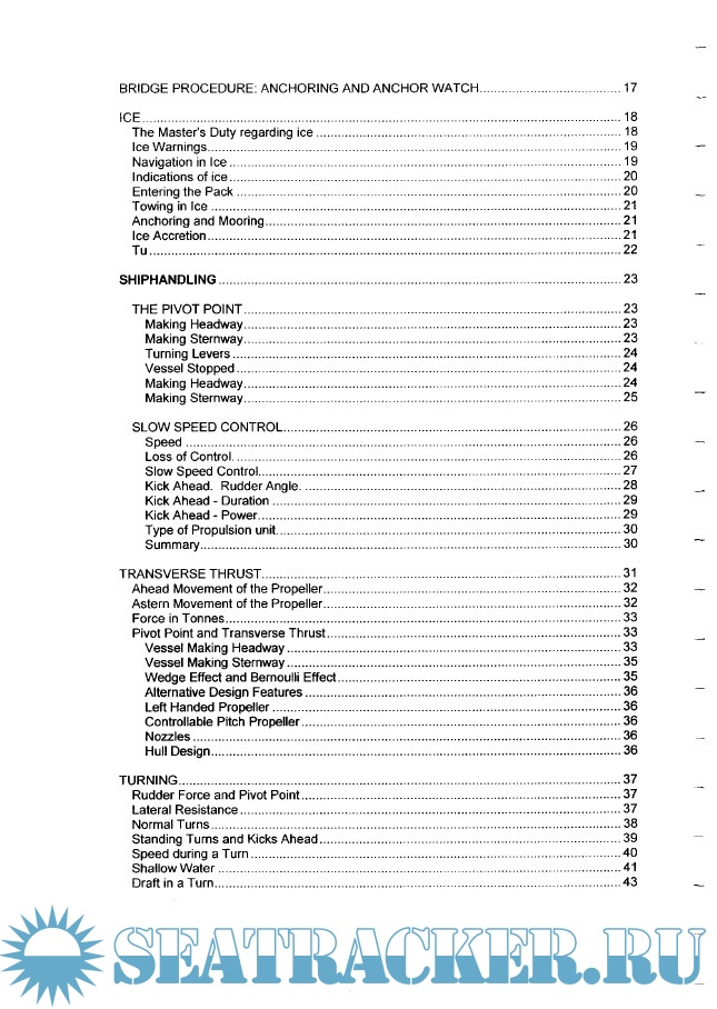 Year: 2006 Language: english Author: Blackpool and The Fylde College Fleetwood Nautical Campus Genre: Training courses Publisher: Blackpool and The Fylde College Fleetwood Nautical Campus Format: PDF Quality: OCR with errors Pages count: 88 Description: Unit 5: Watchkeeping: •Know bridge watchkeeping procedures •Understand the procedures relating to communications with bridge and engine personnel •Know action to take if ice or icing is observed or suspected Manoeuvring the vessel: •Knowledge of the effects on manoeuvring, turning circles and stopping distances of: (a) Deadweight (b) Draught and trim (c) Speed and rudder angle (d) Transverse thrust (e) Single, twin and controllable pitch and fixed pitch propellers (f) Underkeelclearance (g) wind, current and tidal stream (h) Squat and shallow water effects (i) Vessel/vessel and vessel/bank interaction (j) Interaction between tugs and vessels. Dangers of girding (k) Dangerso f pitching, pounding, rollings, synchronous rolling, racing and broaching to. •Know how to make the following manoeuvres (a) Turning short round (b) Emergency stop (c) Man overboard manoeuvres (d) Manoeuvre to minimise collision damage (e) Turning in heavy weather