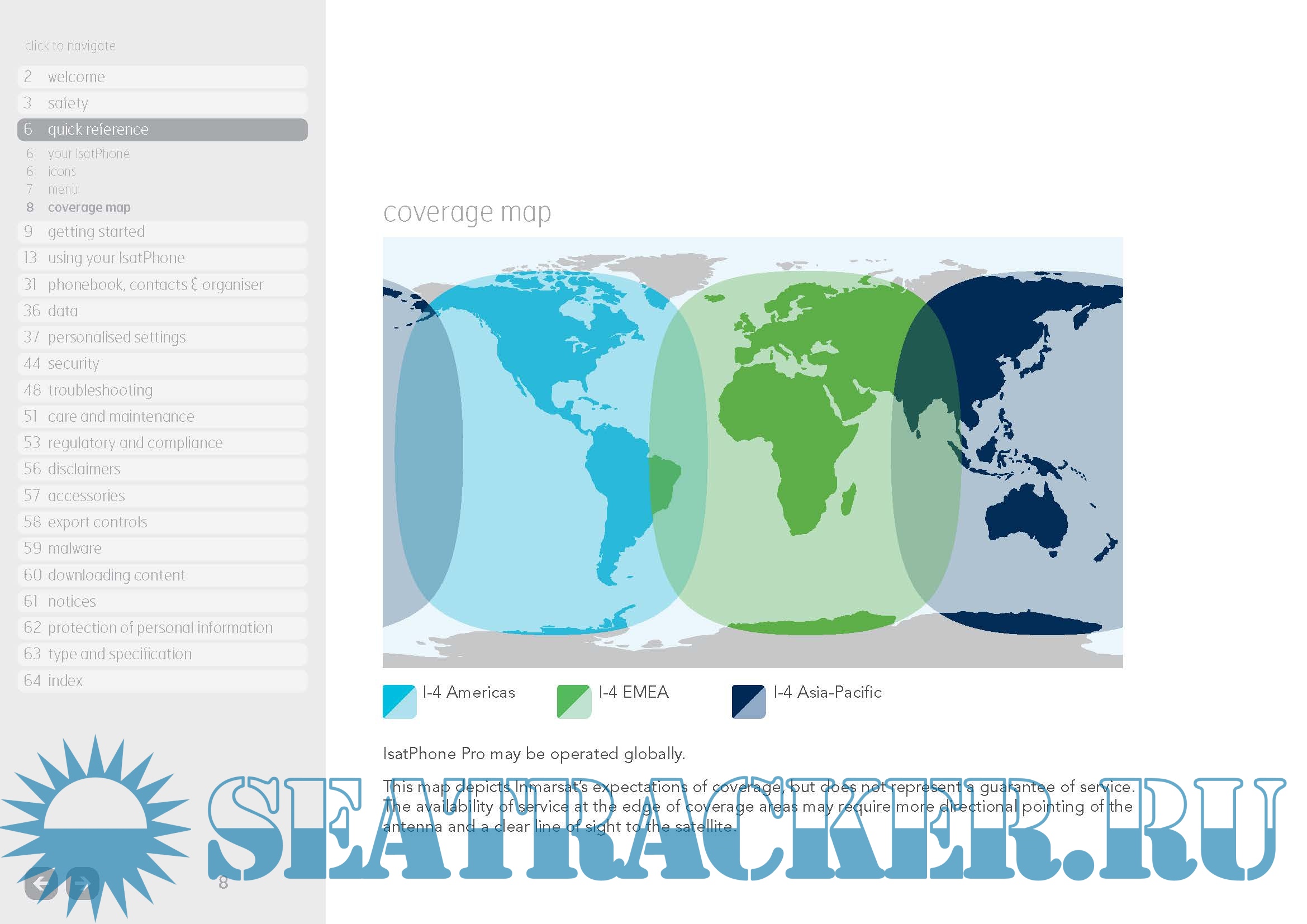 Description: IsatPhone Pro may be operated globally. The availability of service at the edge of coverage areas may require more directional pointing of the antenna and a clear line of sight to the satellite.