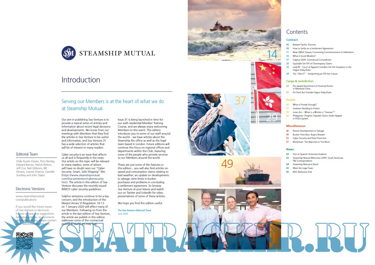 Year: 2020 Language: english Author: SteamShip Mutual Genre: Periodical (magazine) Format: PDF Quality: eBook Pages count: >500 Description: Our aim in publishing Sea Venture is to provide a topical series of articles and information about recent legal decisions and developments. We know from our meetings with Members that they find the articles in Sea Venture to be useful and informative, and Sea Venture has a wide selection of articles that will be of interest to many readers. Browse Sea Venture at your leisure and watch out on Twitter and LinkedIn for video presentations of some of these articles. We hope you find this edition useful.
