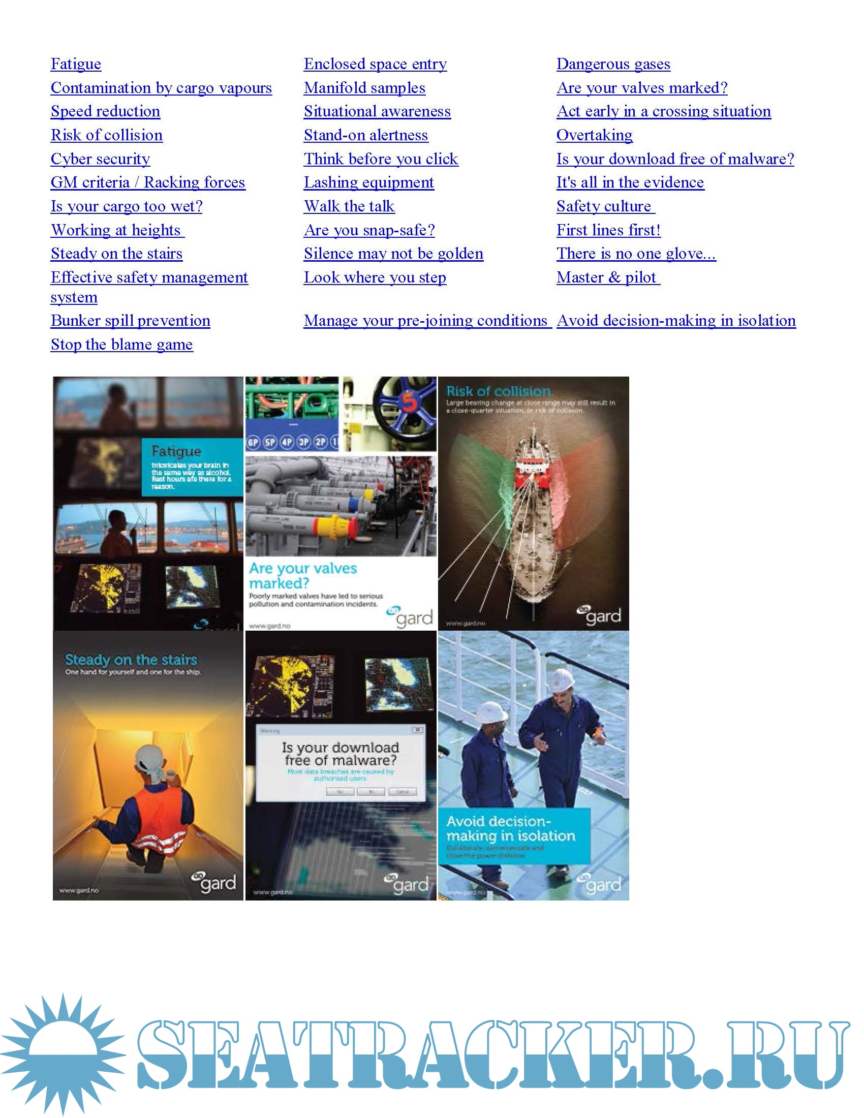 Year: 2019 Language: english Author: GARD Genre: Other Format: PDF Quality: eBook Pages count: 34 Description: It is important to raise the awareness of safety issues among our seafarers to contribute to the prevention of accidents on board ships. To assist in this effort, Gard has developed safety posters focussing on a range of issues linked to ship board operations.