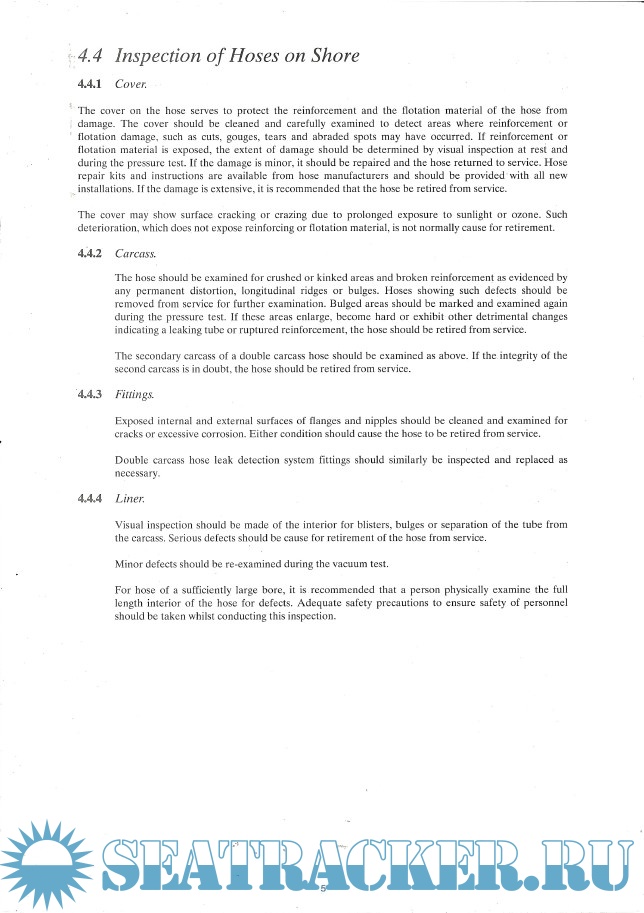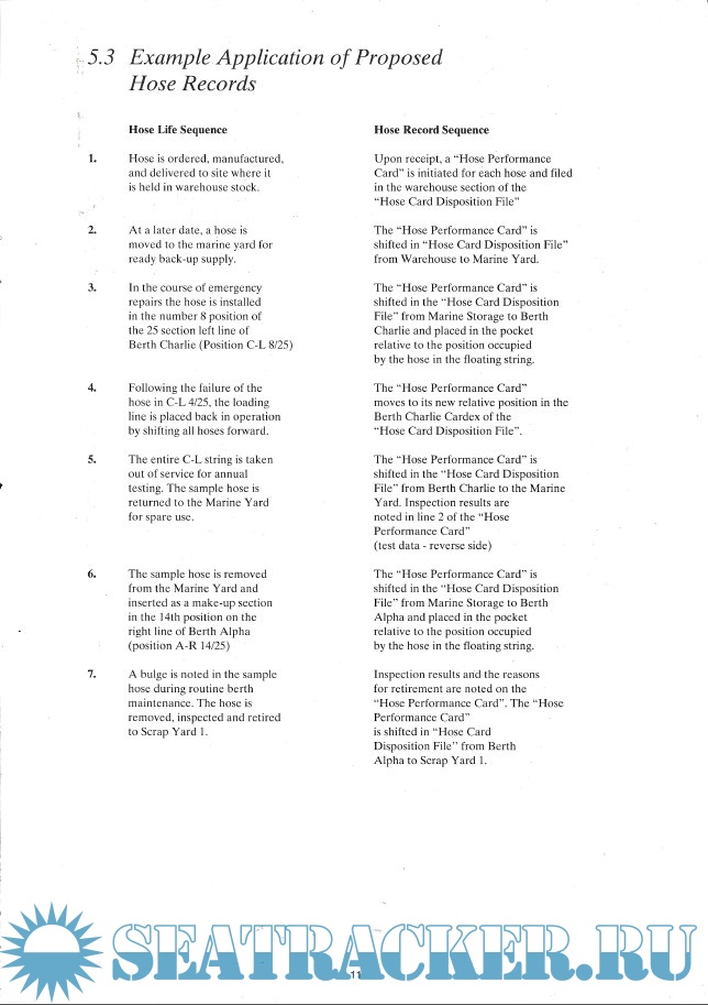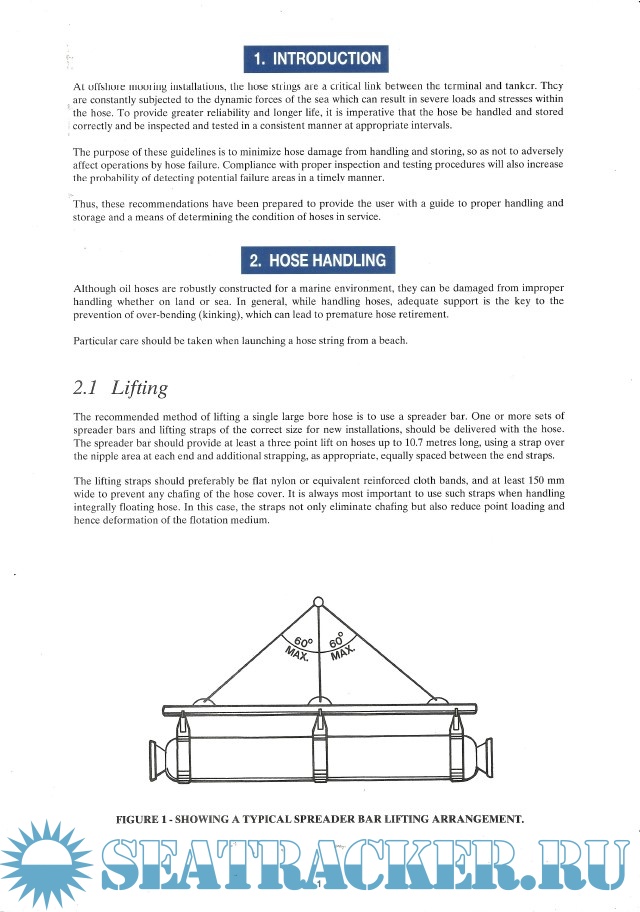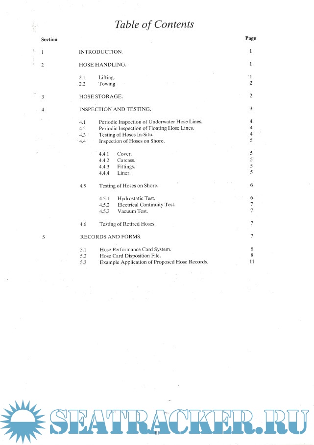 Year: 1995 Language: english Author: OCIMF Genre: Guide Publisher: Witherby & Co. Ltd. Edition: 2nd ISBN: 1856090701 Format: PDF Quality: Scanned pages Pages count: 11 Description: At Offshore mooring installations, the hose strings are a critical link between the terminal and tanker. They are constantly subjected to the dynamic forces of the sea which can result in severe loads and stresses within the hose. To provide greater reliability and longer life, it is imperative that the hose be handled and stored correctly and be inspected and tested in a consistent manner at appropriate intervals. The purpose of these guidelines is to minimize hose damage from handling and storing, so as not to adversely affect operations by hose failure. Compliance with proper inspection and testing procedures will also increase the probability of detecting potential failure areas in a timely manner. Thus, these recommendations have been prepared to provide the user with a guide to proper handling and storage and a means of determining the condition of hoses in service.