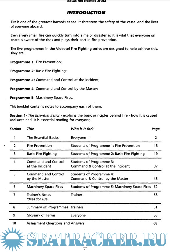 Year: 2000 Language: english Author: VIDEOTEL Genre: Training courses Publisher: VIDEOTEL Format: PDF Quality: Scanned pages Pages count: 81 Description: Fire is one of the greatest hazards at sea. It threatens the safety of the vessel and the lives of everyone on board. Even a small fire can quickly turn into a major disaster so it is vital that everyone onboard is aware of the risks and plays their part in fire prevention. Videos are not included in this post.