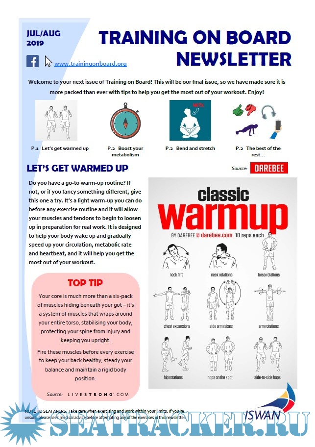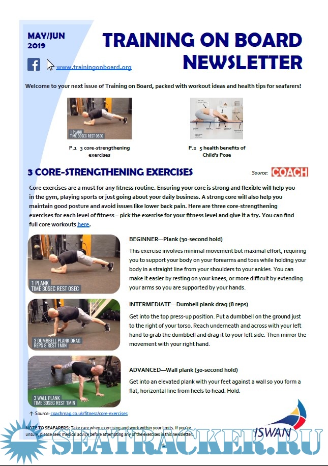 Year: 2019 Language: english Author: ISWAN Genre: Training courses Publisher: International Seafarers' Welfare & Assistance Network Format: PDF Quality: eBook Pages count: >50 Description: Training on Board (TOB) is an international training, nutrition and health project initiated by the Norwegian Maritime Authority in Haugesund on behalf of ISWAN. Training on Board offers seafarers an accessible, free, and motivational training programme that will encourage them to take care of their own health and fitness. The project is fully funded by ITF Seafarers' Trust. The main feature of the project is that a seafarer should be able to train on board with simple equipment or even without any equipment at all. For a beginner, participation in TOB can lead to a big difference in fitness. TOB had a short-term objective to increase training on board a ship by 20%. The long-term objective was to permanently reduce the number of seafarers losing their health certificates. Additional info: This project is no longer running.