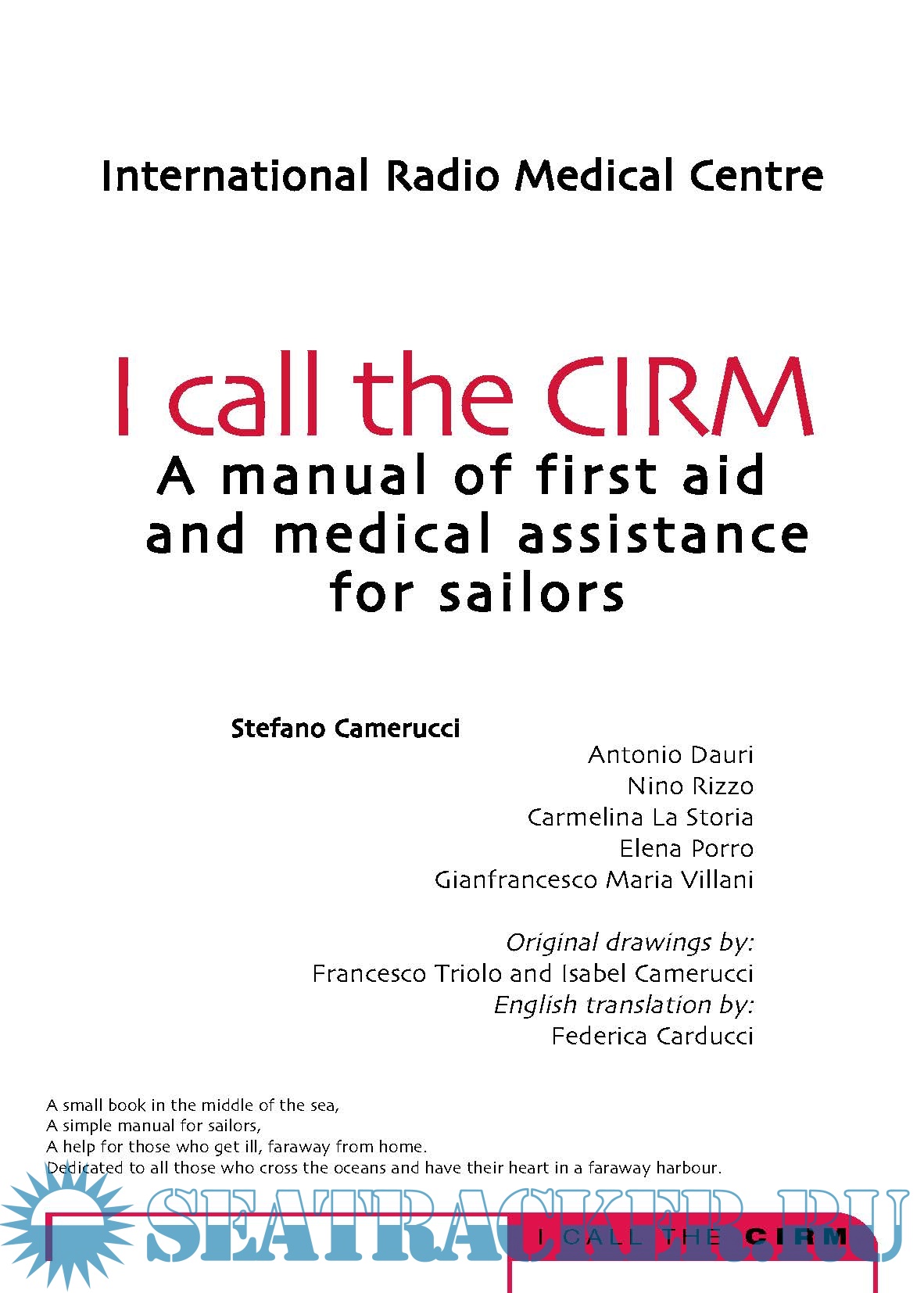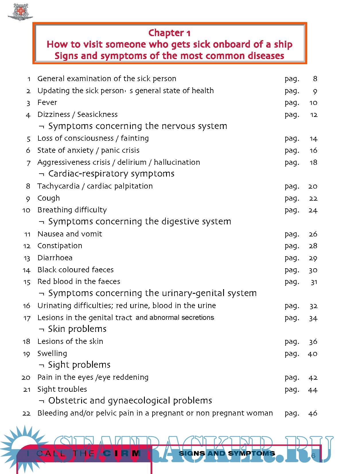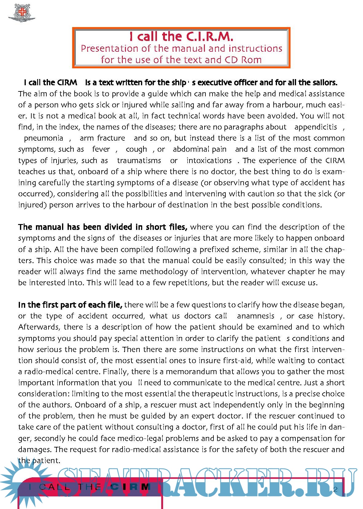 It is not a medical book at all, in fact technical words have been avoided. You will not find, in the index, the names of the diseases; there are no paragraphs about appendicitis , pneumonia , arm fracture and so on, but instead there is a list of the most common symptoms, such as fever , cough , or abdominal pain and a list of the most common types of injuries, such as traumatisms or intoxications . The experience of the CIRM teaches us that, onboard of a ship where there is no doctor, the best thing to do is examining carefully the starting symptoms of a disease or observing what type of accident has occurred, considering all the possibilities and intervening with caution so that the sick or injured person arrives to the harbour of destination in the best possible conditions.