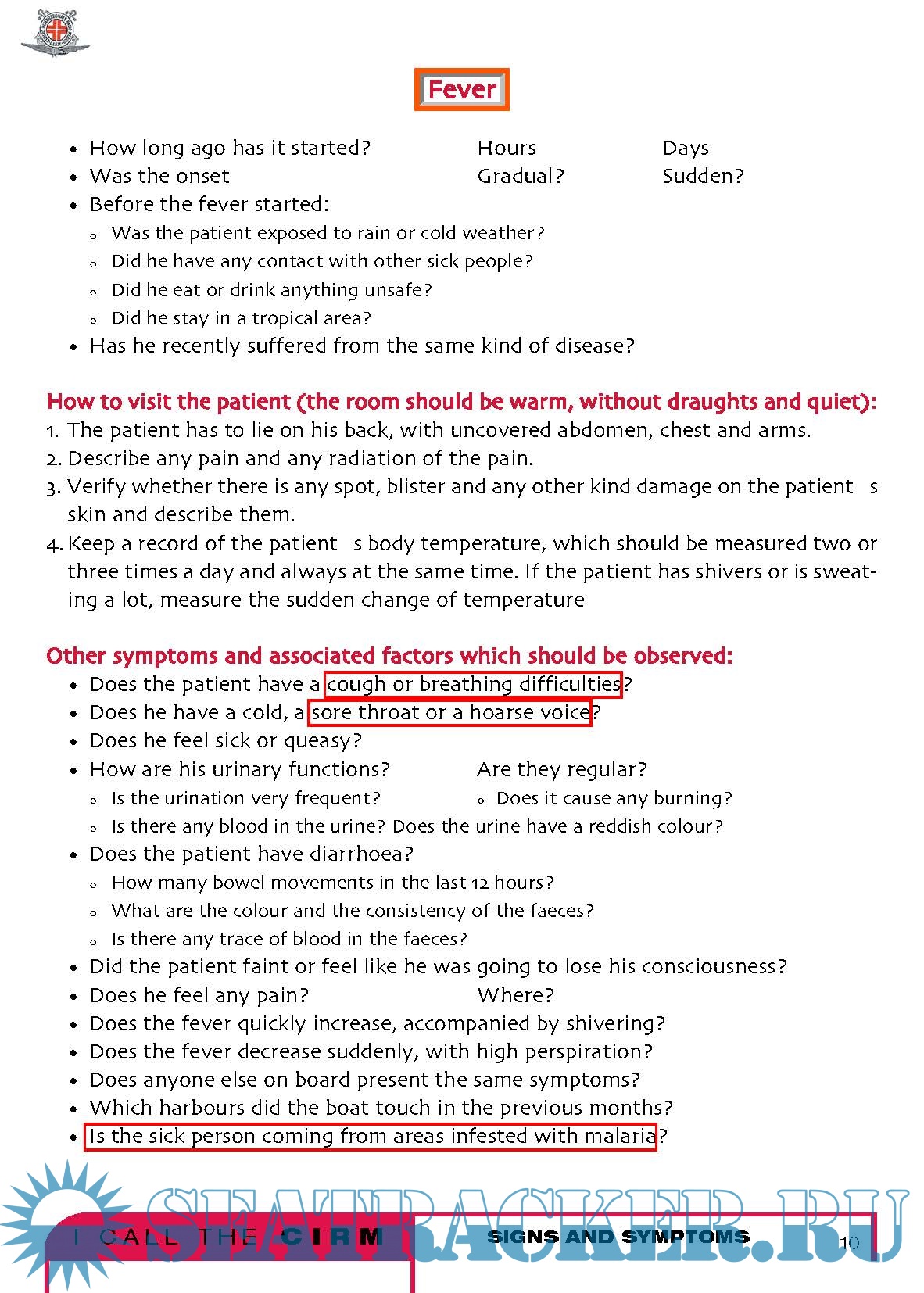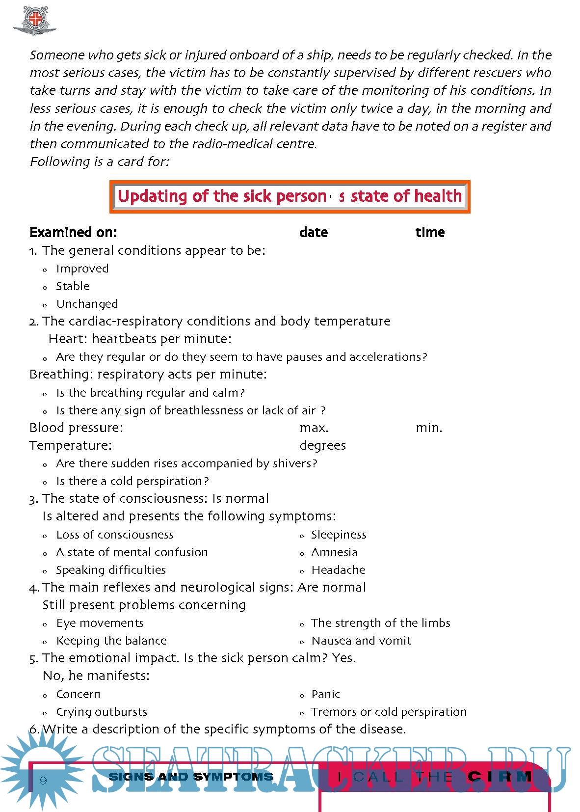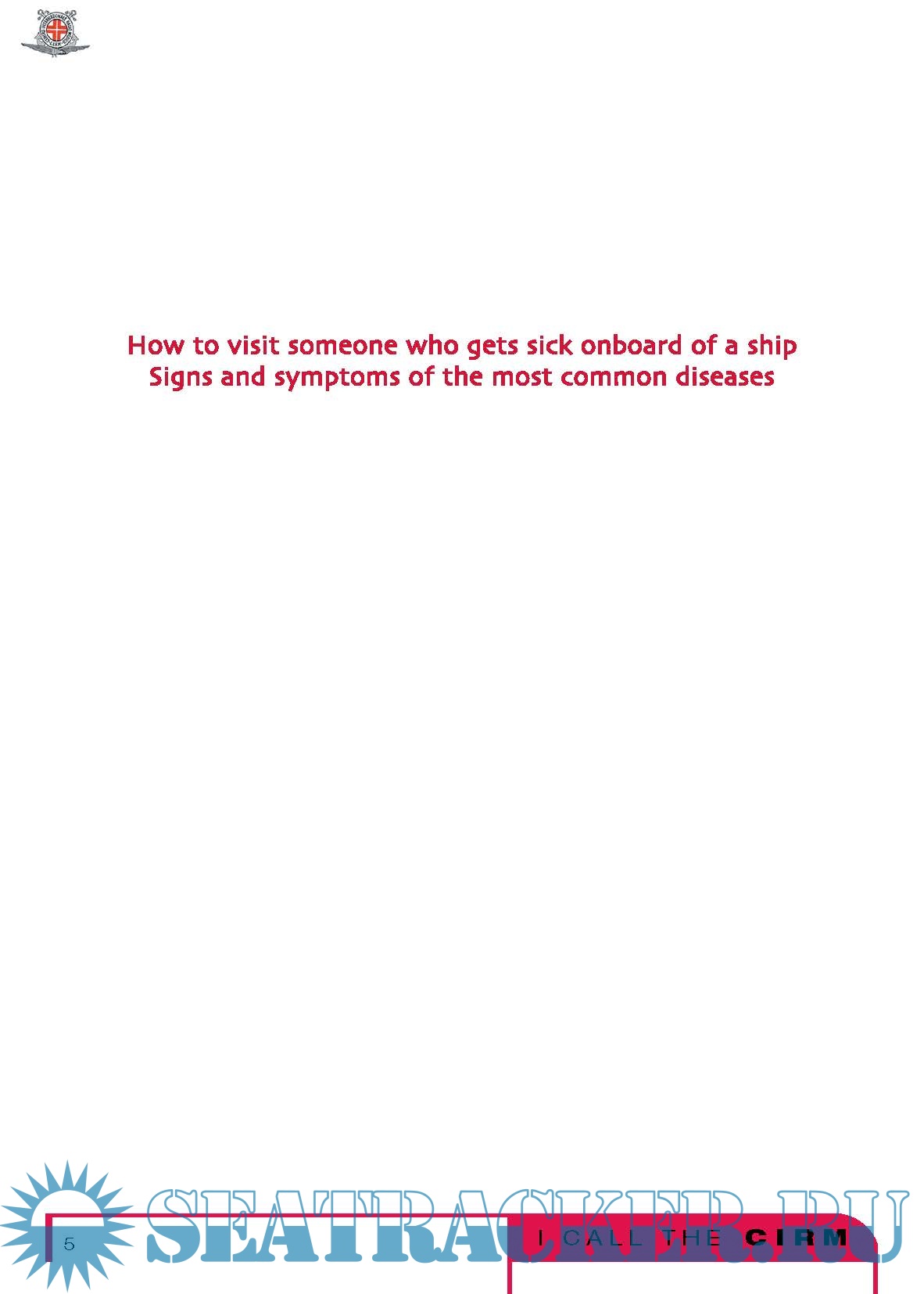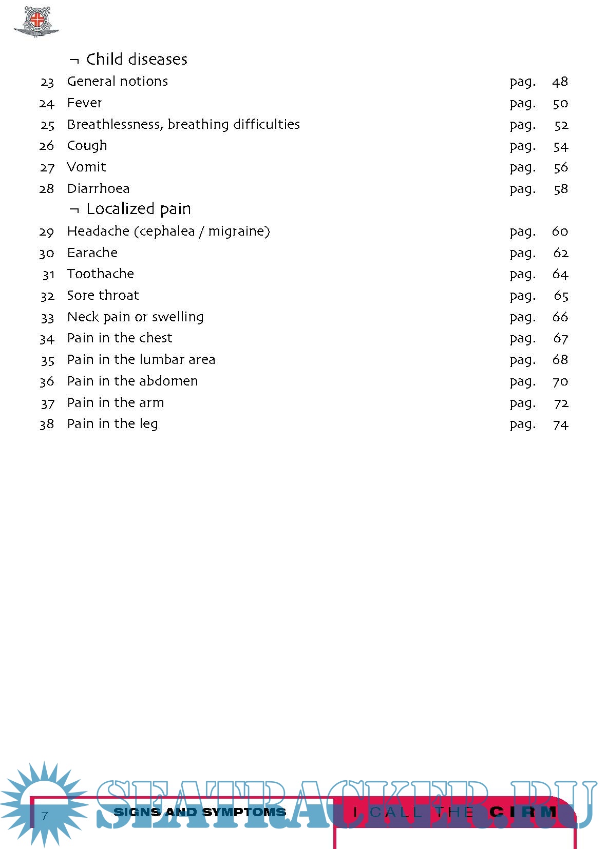 It is not a medical book at all, in fact technical words have been avoided. You will not find, in the index, the names of the diseases; there are no paragraphs about appendicitis , pneumonia , arm fracture and so on, but instead there is a list of the most common symptoms, such as fever , cough , or abdominal pain and a list of the most common types of injuries, such as traumatisms or intoxications . The experience of the CIRM teaches us that, onboard of a ship where there is no doctor, the best thing to do is examining carefully the starting symptoms of a disease or observing what type of accident has occurred, considering all the possibilities and intervening with caution so that the sick or injured person arrives to the harbour of destination in the best possible conditions.