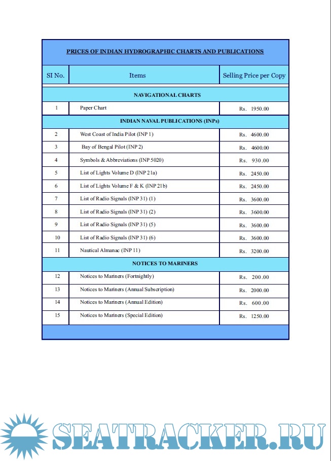 Year: 2021 Language: english Author: National Hydrographic Office, India Genre: Catalogue Publisher: National Hydrographic Office, India Format: PDF Quality: eBook Pages count: 25 Description: The Indian Naval Hydrographic Department (INHD) functions under the Chief Hydrographer to the Government of India. The Department, being the nodal agency for Hydrographic surveys and Nautical charting in India, has a very well established organizational setup.The Chief Hydrographer to the Government of India is the NAVAREA VIII coordinator and is also the National Coordinator for NAVTEX services along Indian coast.This catalogue is published on an annual basis.