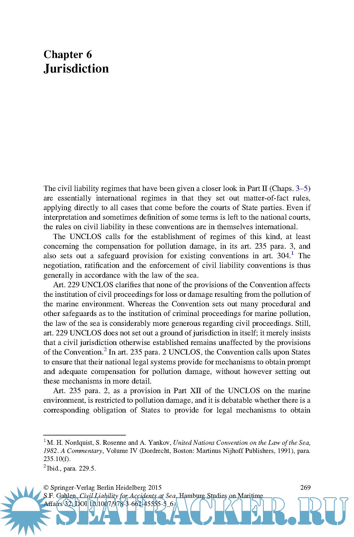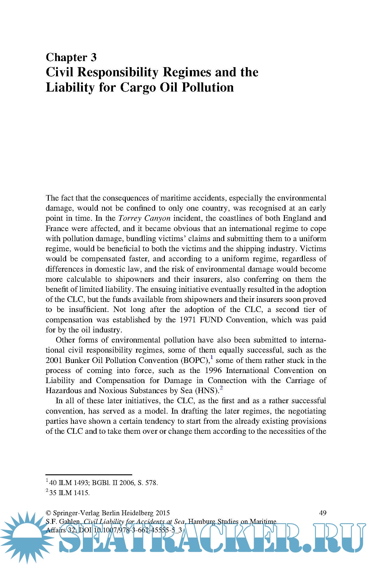 Although there is an international legal framework that covers the most frequent types of cases, questions remain regarding the interplay of international and national legislation. Addressing those questions, the first part of this study analyses the rules and the limits of international regulation applicable at sea, namely regarding compensation for pollution damage. The second part focuses on the jurisdictional rules and conflict-of-law rules that may be used to deal with cases beyond the scope of international legislation, in accordance with the law of the sea.