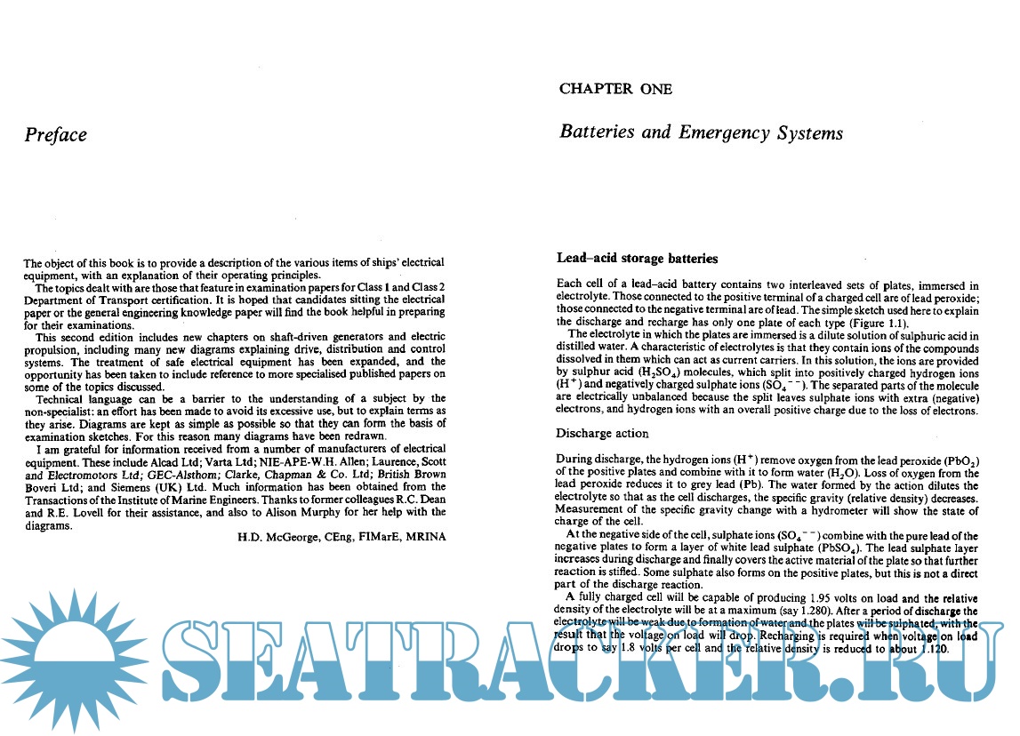 Year: 1993 Language: english Author: H. D. McGeorge Genre: Textbook Publisher: Butterworth-Heinemann Edition: 2nd ISBN: 9780750616478 Format: PDF Quality: Scanned pages Pages count: 168 Description: Caters for marine engineer candidates for Department of Transport Certification as Marine Engineer Class One and Class Two. It covers the various items of ships' electrical equipment and explains operating principles. David McGeorge is a former lecturer in Marine Engineering at the College of Maritime Studies, Warsash, Southampton. He is the author of General Engineering Knowledge. CONTENTS INCLUDE; Preface; Batteries and emergency systems; Electronic equipment; A.C. alternators; A.C. switchboards and distribution systems; A.C. motors; D.C. generators; D.C. switchboards and distribution systems; D.C. motors; Safe electrical equipment for hazardous areas; Shaft-driven generators; Electric propulsion; Miscellaneous items; Index.