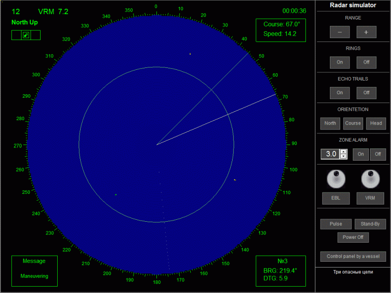 Имитатор судовой РЛС это симулятор радара классического вида позволяющий вести в реальном масштабе времени радиолокационное наблюдение за судами в открытом море до 5-ти целей одновременно со следующими функциями: