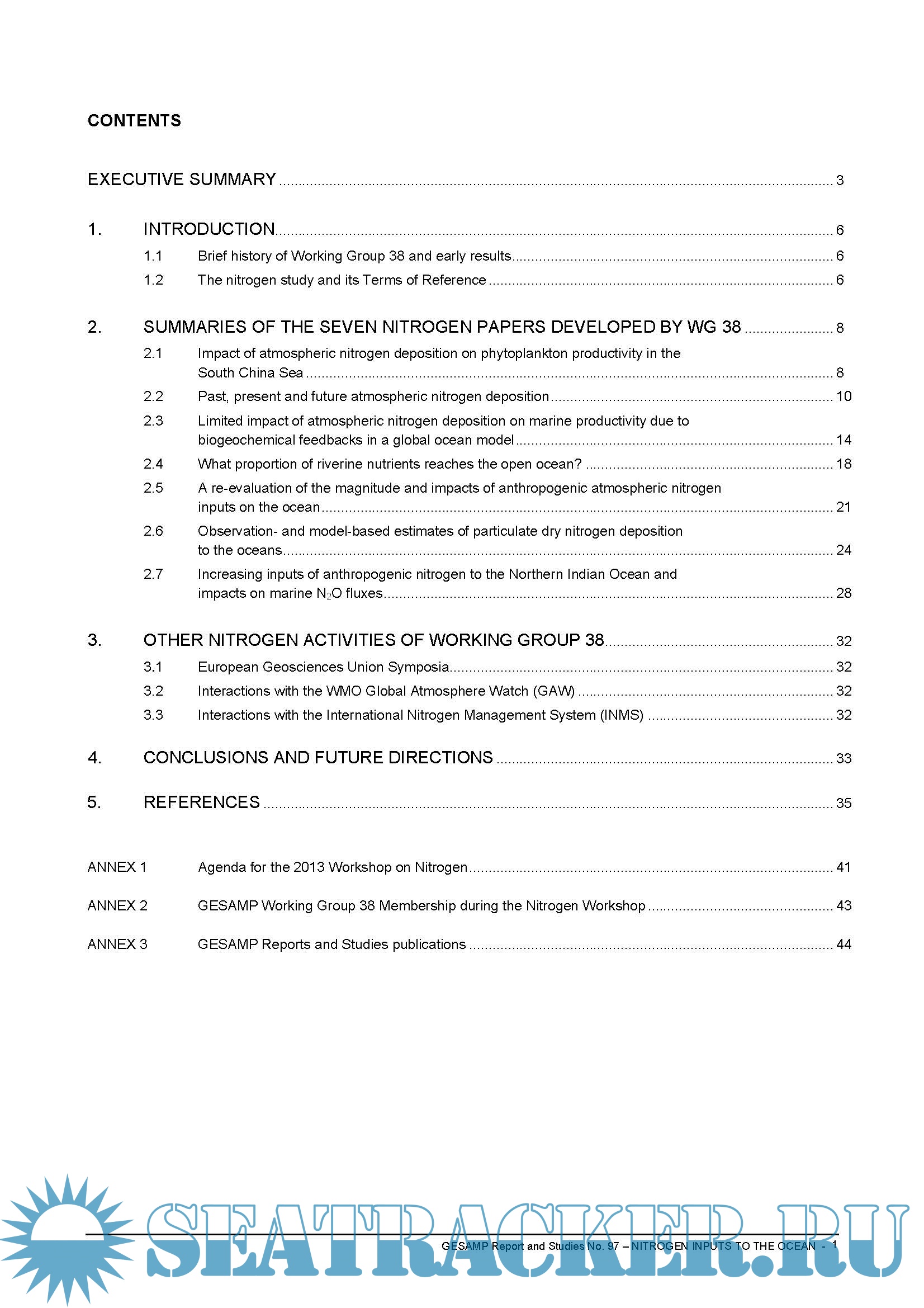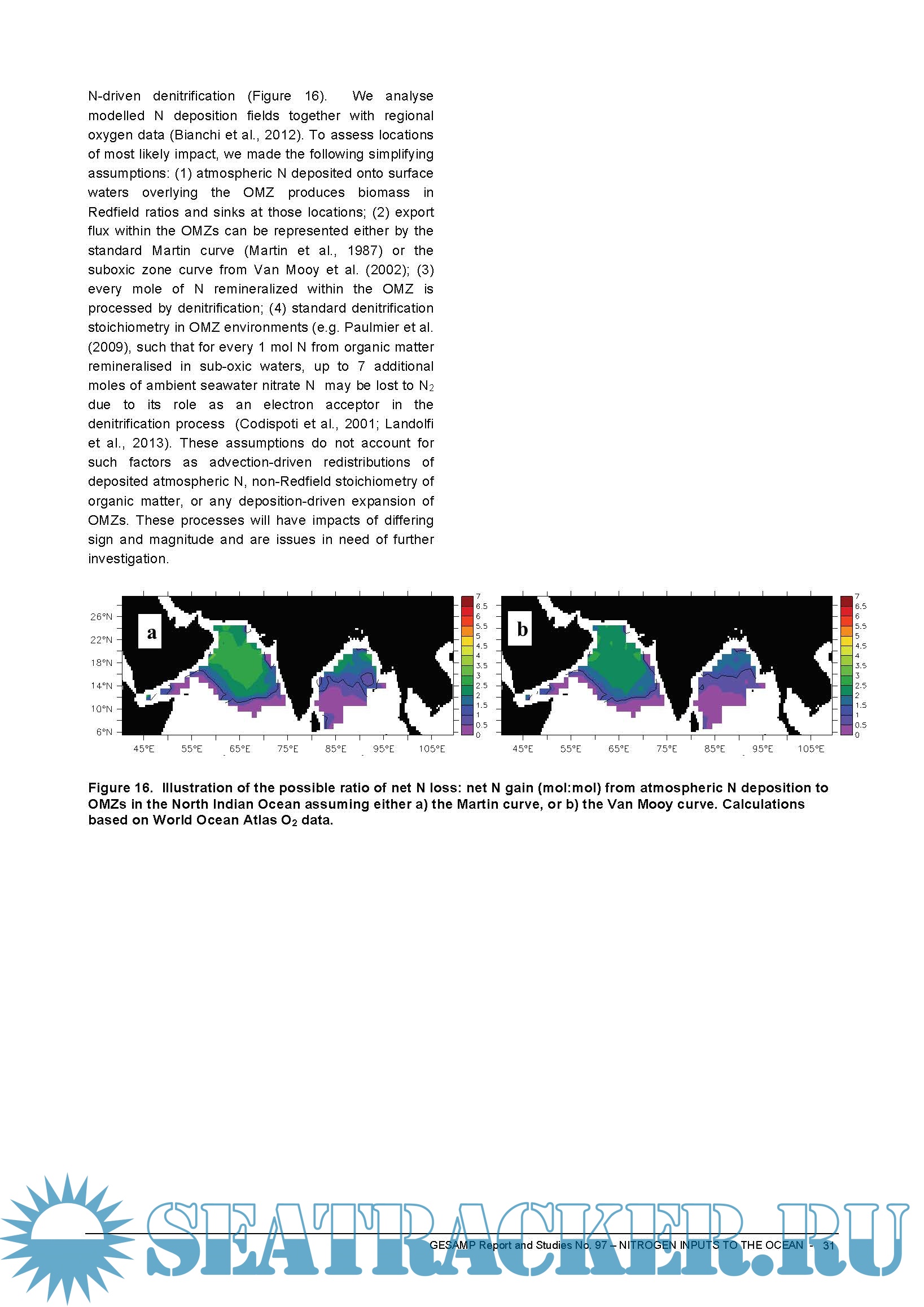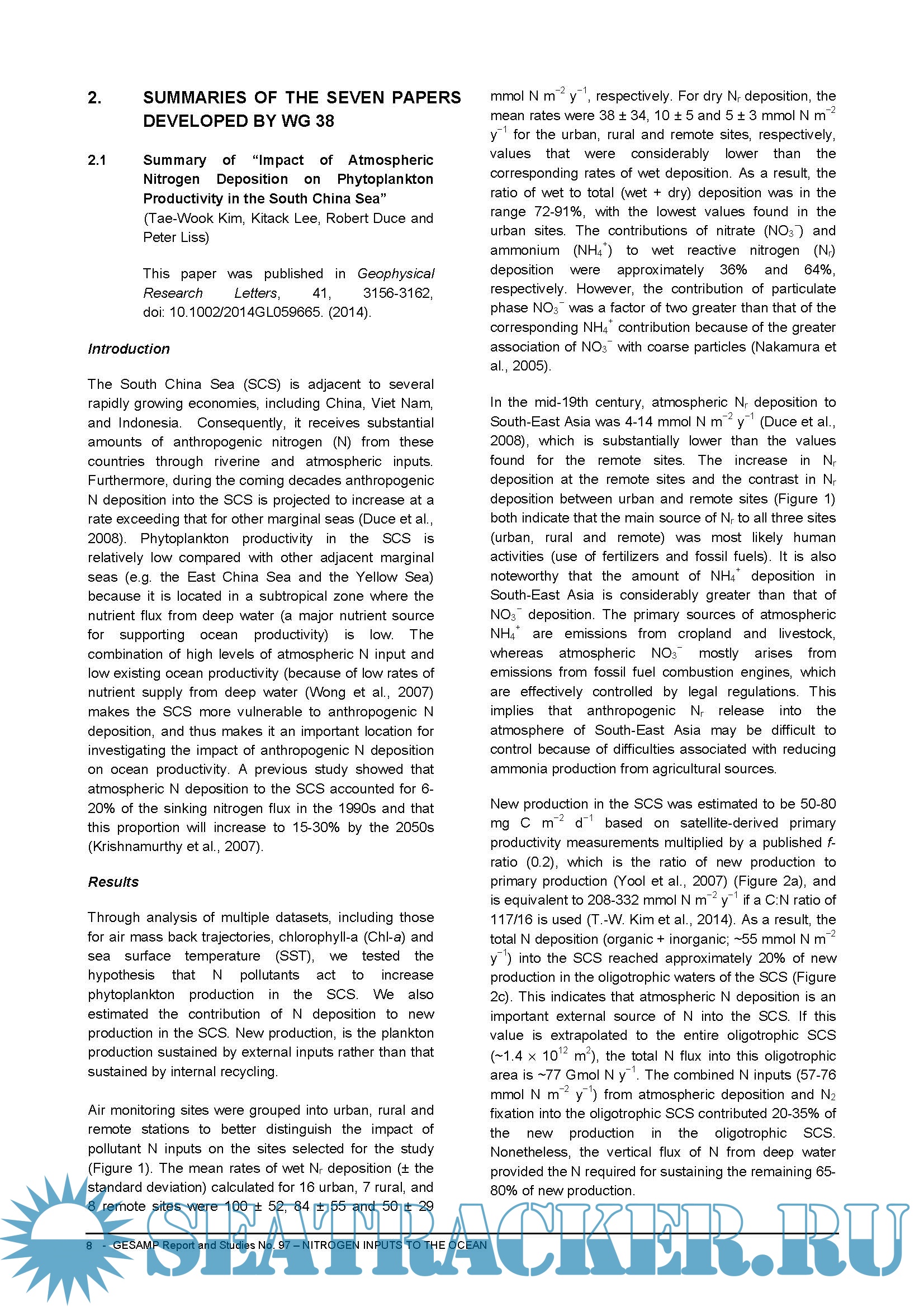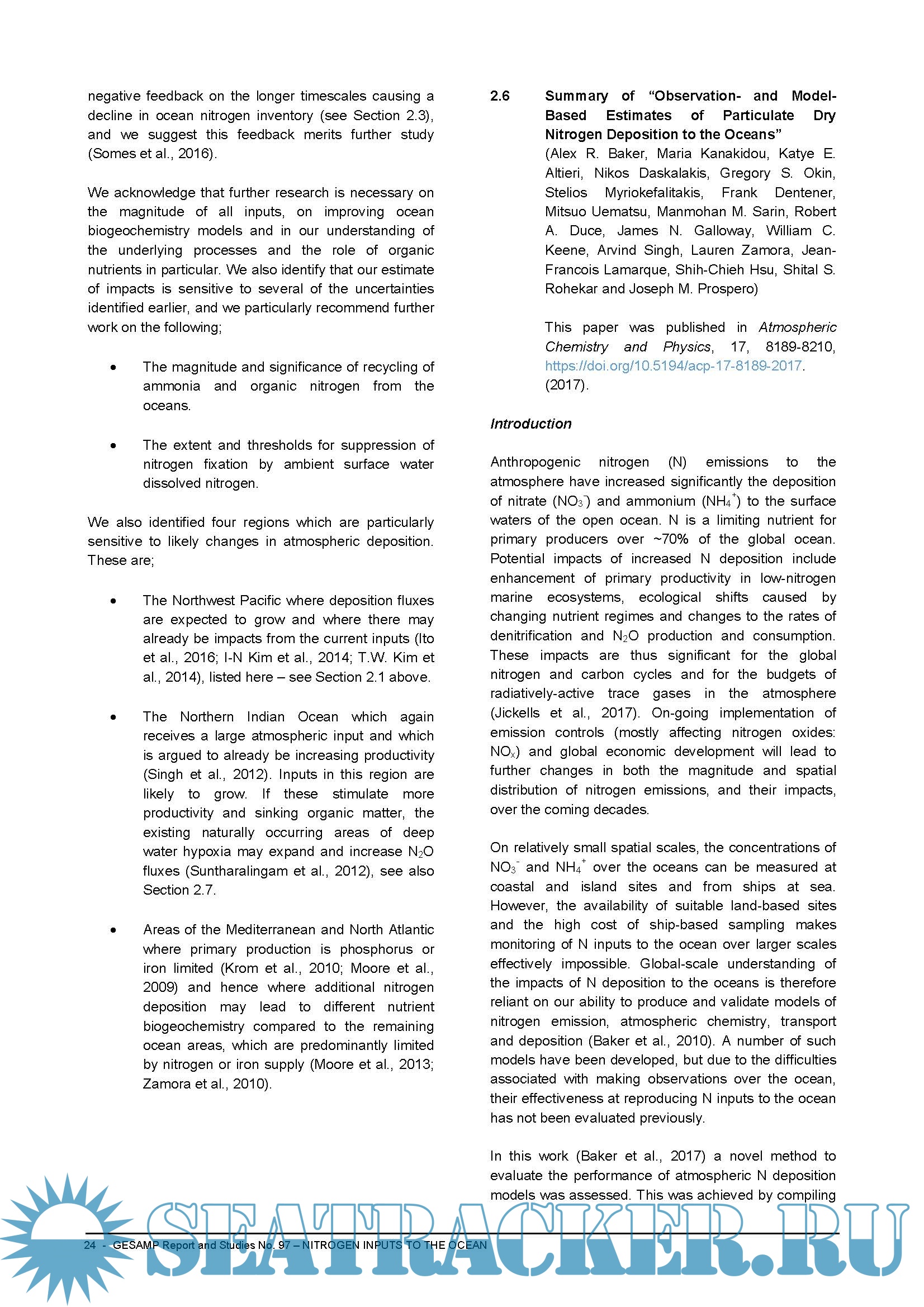 Year: 2018 Language: english Author: GESAMP Genre: Research papers Format: PDF Quality: eBook Pages count: 52 Description: The present global modelling study of the Nr atmospheric cycle and Nr deposition to the ocean is the first that evaluates past, present and future Nr atmospheric deposition accounting for ON primary sources as well as for secondary ON chemical formation as a N-dependent process. While the total Nr deposition to the ocean is not expected to change significantly by 2050, the relative importance of oxidized and reduced N is expected to change, with an increasing proportion of ammonium compared to nitrate, resulting from more efficient controls on terrestrial emissions of nitrogen oxides (NOx) compared to ammonia. This would result in a change in the acidity of the atmospheric deposition.