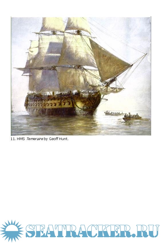 Turner's Temeraire was the second ship in the Royal Navy to carry the name. The first, a French warship captured and commandeered by the British in 1759, served with distinction during the Seven Years' War before being sold off in 1784. The second Temeraire, named in honor of her predecessor, was a prestigious three-decked, 98-gun warship that broke through the French and Spanish line directly astern of Nelson`s flagship Victory at Trafalgar in 1805, saving the Vice-Admiral at a crucial moment in the battle. This tale of two ships spans the heyday of the age of sail: the climaxes of both the Seven Years War (1756-63) and the Napoleonic Wars (1798-1815).