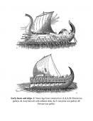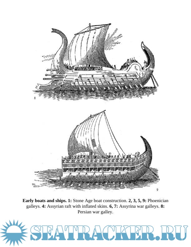 Description: Detailed images — taken from rare sources — depict primitive canoes, a Roman galley, ship figureheads, naval battles, dock scenes, lighthouses, pirate ships, steam-powered battleships, and a wealth of other subjects.