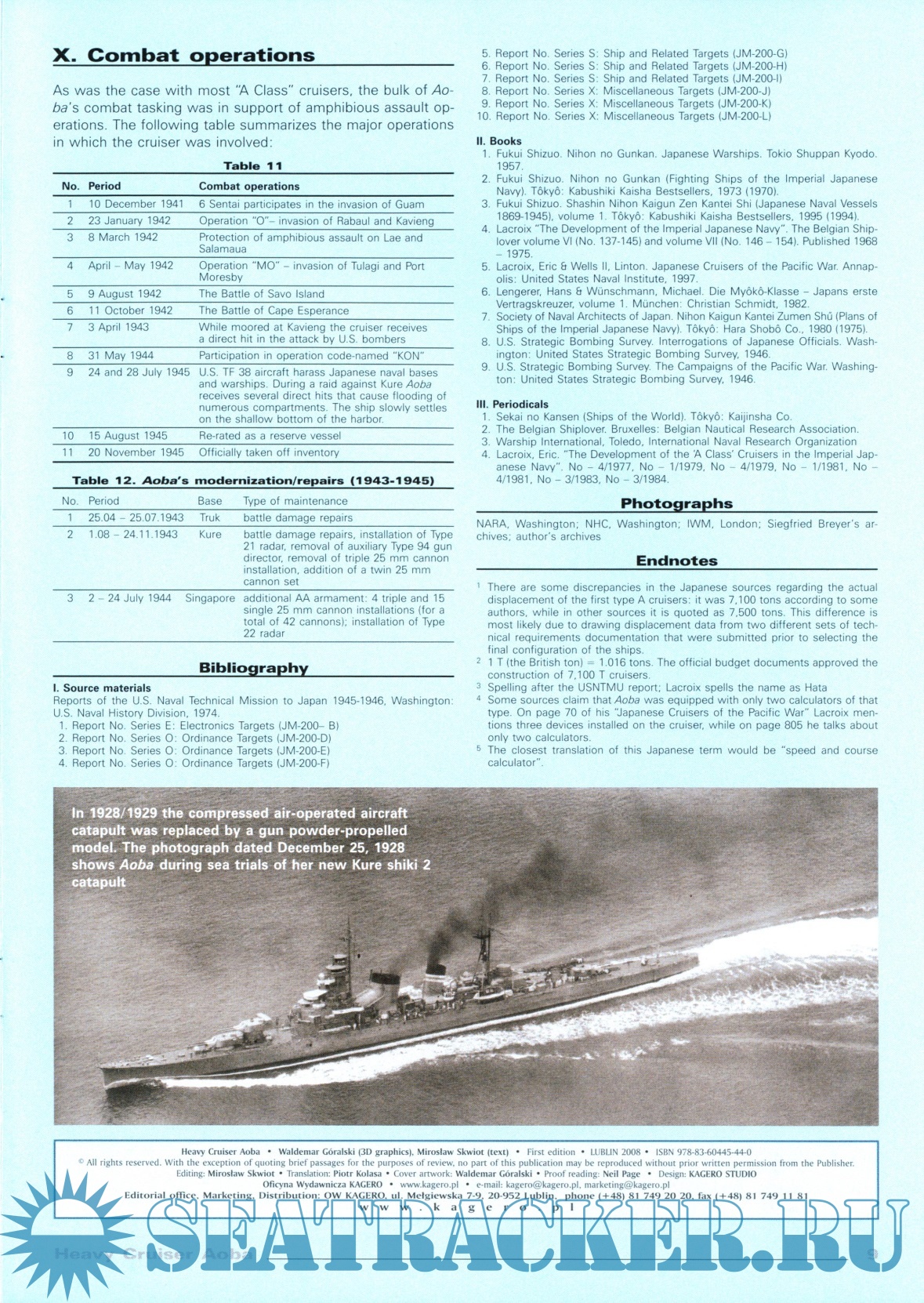 Description: In-depth look at the Japanese heavy cruiser Aoba, veteran of the battles of Coral Sea, Savo Island and Cape Esperance - origins, construction, technical characteristics, armor, propulsion, armament, fire control, aircraft and operational history. Excellent visual guide to the ship from all aspects - overall and in detail - camouflage, modifications, weapons systems, boats, cranes, catapults even seaplanes.